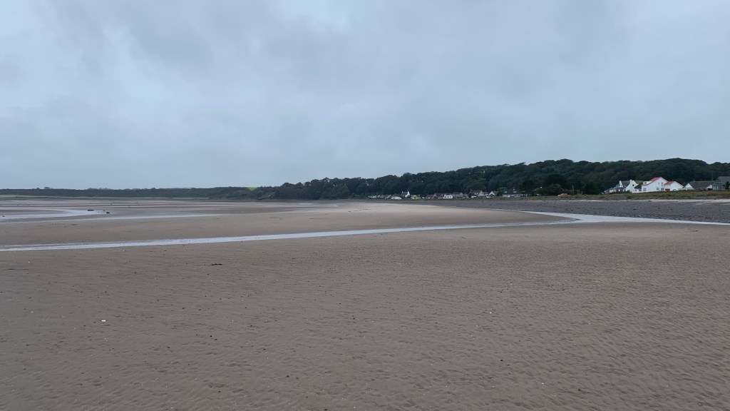 Hubby had found Great Luce beach on the other side of the peninsula, thinking it would be a great place for a walk and stretch The Dog’s legs. So we drove through tiny lanes, surrounded by sheep pastures and stubby wind-bent trees. It was misty and murky with the drizzle, it seemed someone had plonked a Tupperware box over the area, it was that grey. It was quite windy too, the birds struggling against the wind. When they tried to land on the telephone wires, they would overshoot and let the wind push them back so they landed elegantly, clinging tightly onto the wire once they touched base – when they took off, they just got whipped off in the other direction. We ended up in the village of Sandhead and parked up on a vast stretch of grass bordering the beach. And what a splendid beach it is, possibly one of the best beaches in Britain. We donned wet weather gear including The Dog and stepped onto this vast arc of sand, stretching some 6 miles around Luce Bay. It was stunning even in the mizzle. We spotted, way out on the horizon, three stumpy lumps and decided to head towards them across the sands. The Dog was extremely happy, a big smile on her face and looking at us as if we were the best humans in the world. The drizzle and wind was on our backs, and we laughed at The Dog galloping around. We walked and walked, those three stumps refusing to come any nearer, remaining little dots out to sea. But we were determined to reach them regardless. The beach used to be a bombing practice area years ago and the old airfield nearby is disused but still under MoD ownership. We could see the control tower and other associated buildings sitting on the edge of the beach. So we bent our heads down and strolled across channels and sandbanks. The Dog started to give us quizzical looks “where the hell are you two going?”
