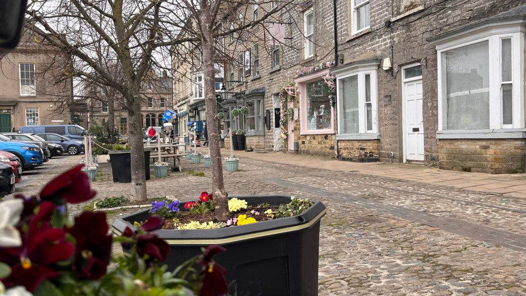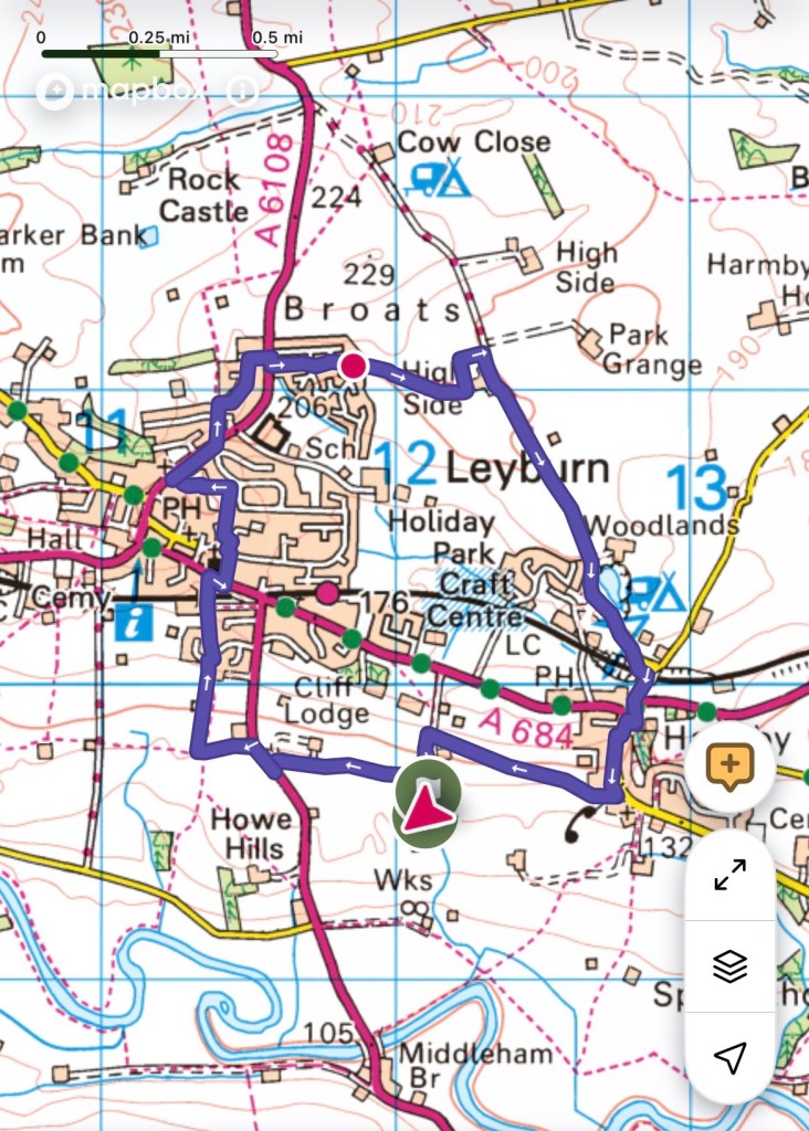 It’s quite cold in the van so the heater went on. Outside it’s eerily misty with the sun unable to poke through and a heavy dew dripping from the awning. We did our ablutions, tidied up, washed our breakfast things and decided to go for a walk. The mist has lifted, but it’s still very hazy – though strangely warmer than the conditions suggest. We decided to walk into Leyburn and followed a couple of hikers dressed in thick coats, woolly hats and gloves. I’ve just got a thick jumper and my gilet on and feeling hot. Am I going to regret this?