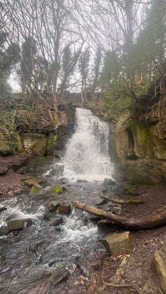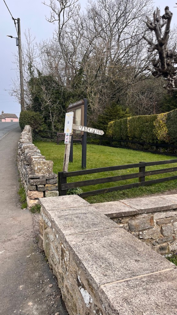 We wandered out to the edge of town before turning right through a modern housing estate before being burped out into countryside again. There were really no outstanding views with the misty conditions, but it was warm. We dropped down into the village of Harmby again and walked past a little sign marked “waterfall”. Hidden behind housing and just off the road was a little glen/steep valley with a cascading waterfall at one end. Without the little sign, you wouldn’t know it was there. It fed a little beck that tumbled down the hill surrounded by tall trees – a beautiful little gem of a place. We followed the dirt path and found ourselves in a little estate of bungalows shortly after. We trotted down to the main road and picked up our footpath that cuts across from Harmby to our little camping site.