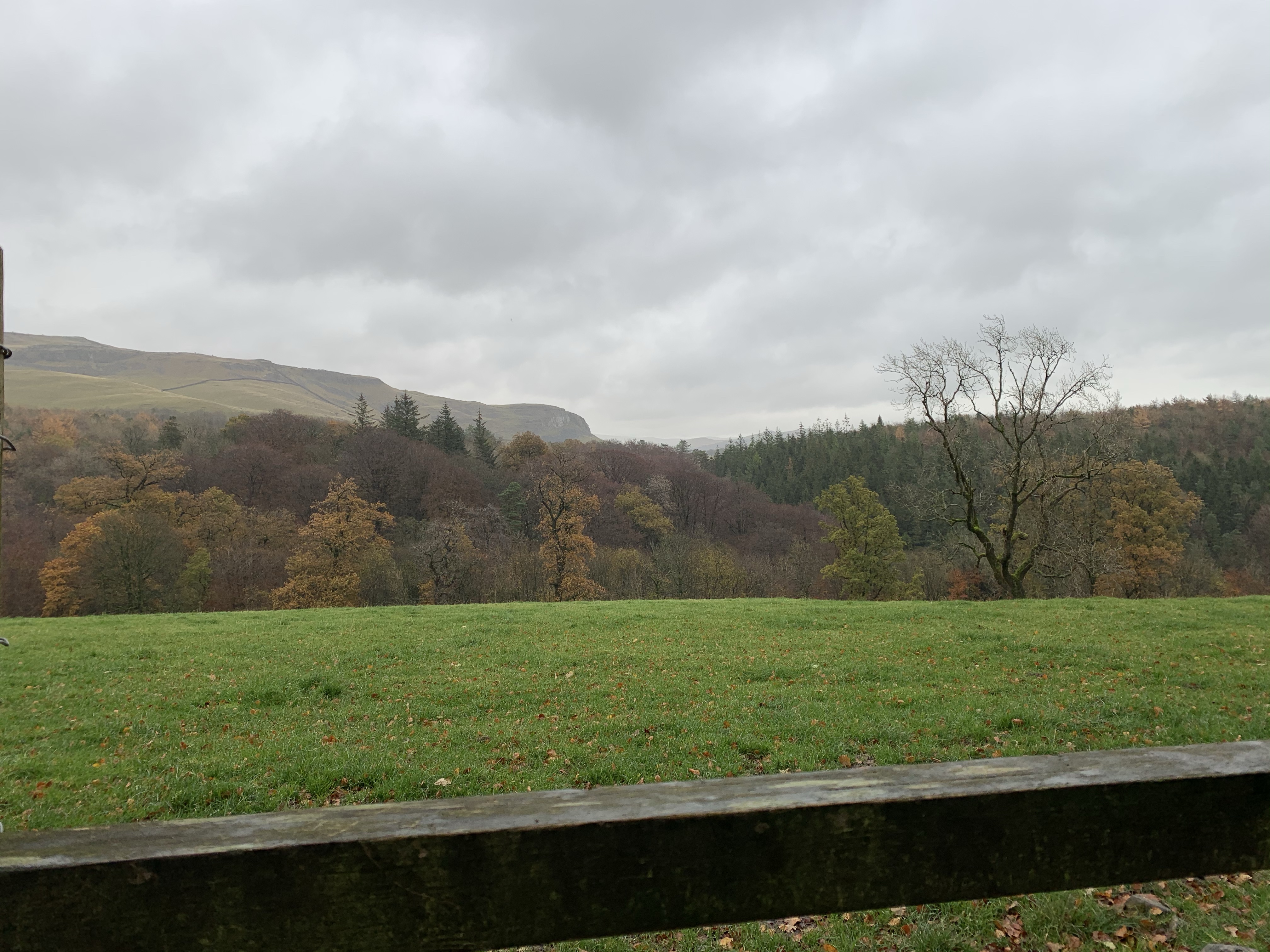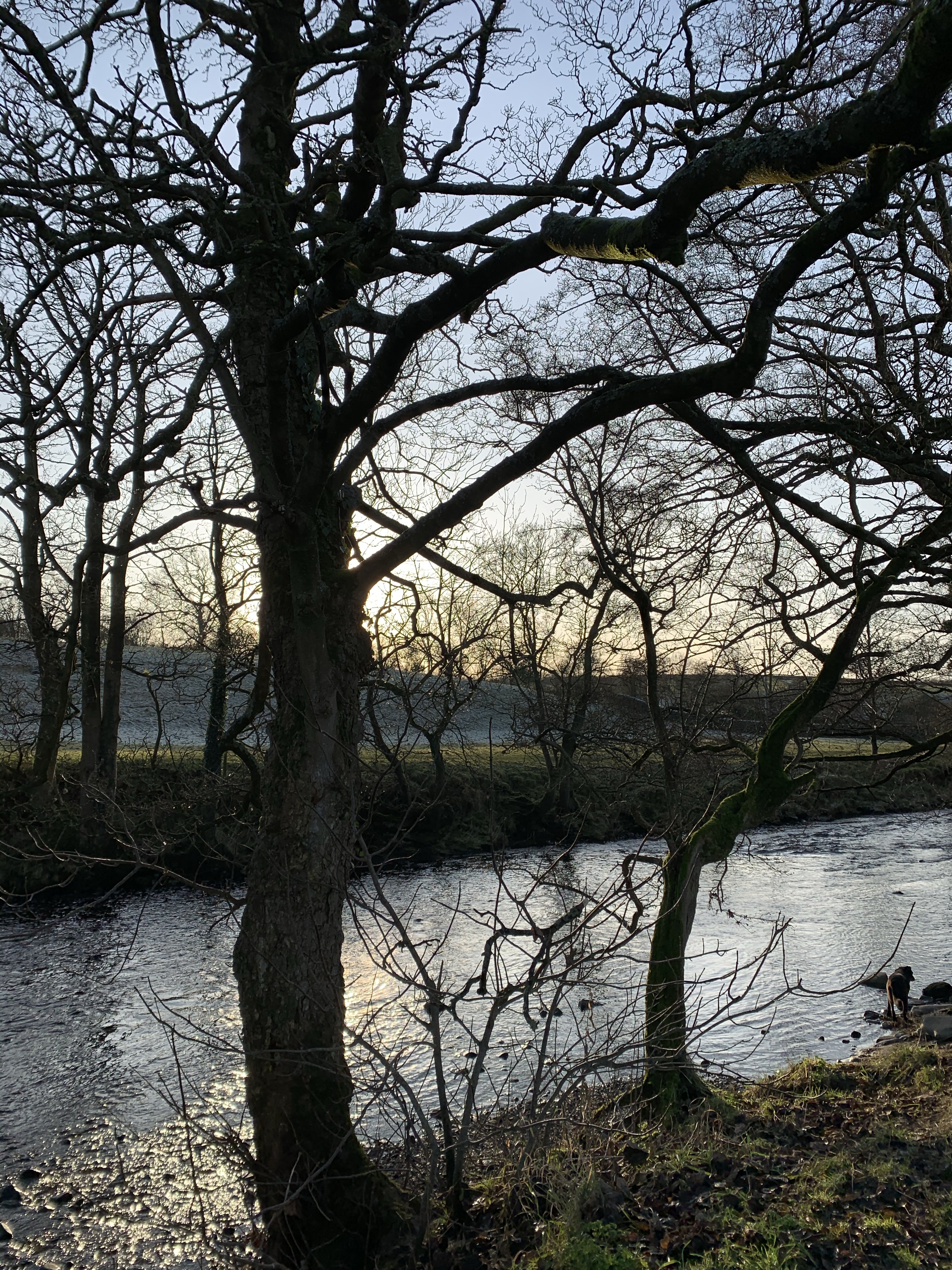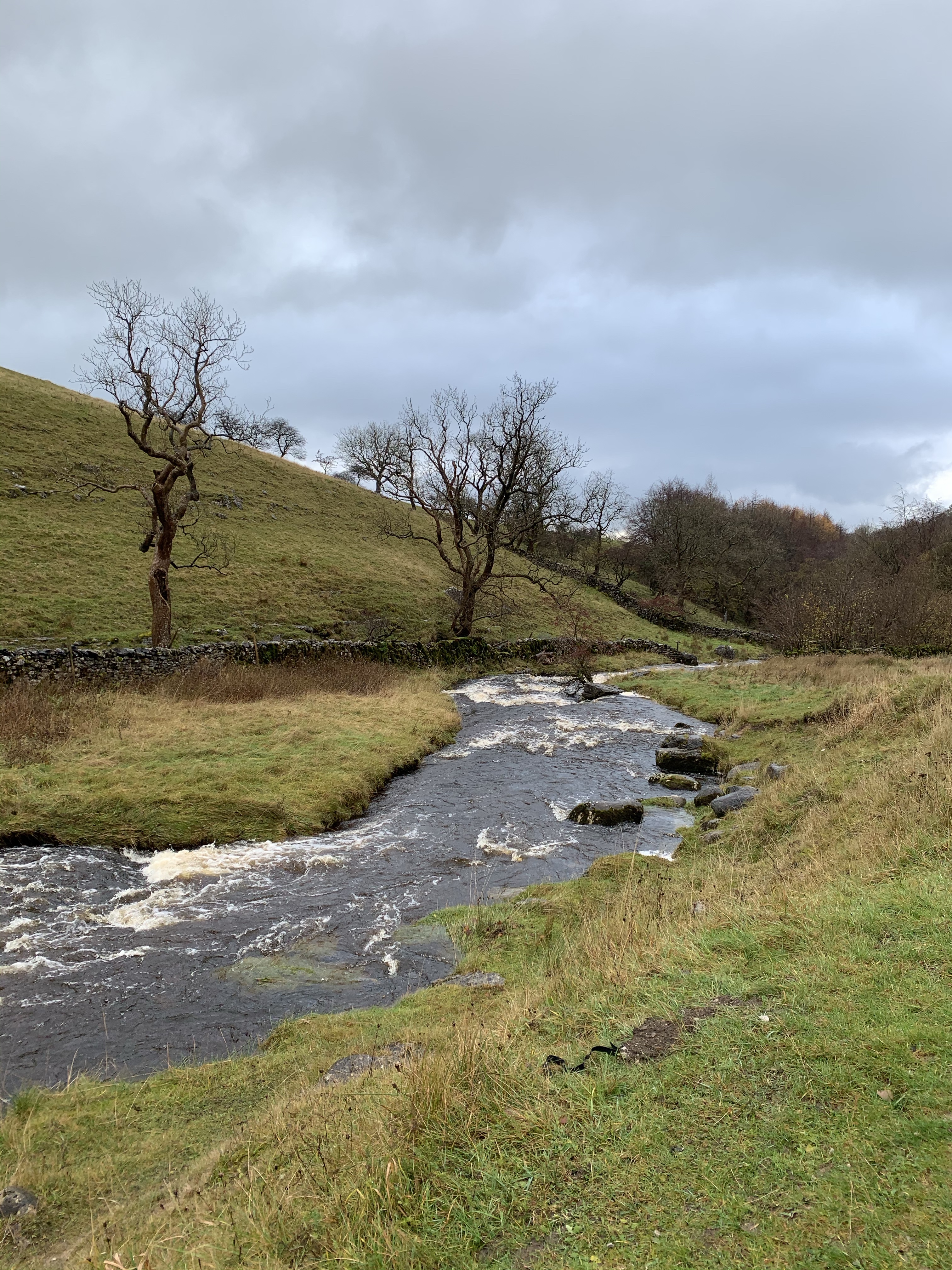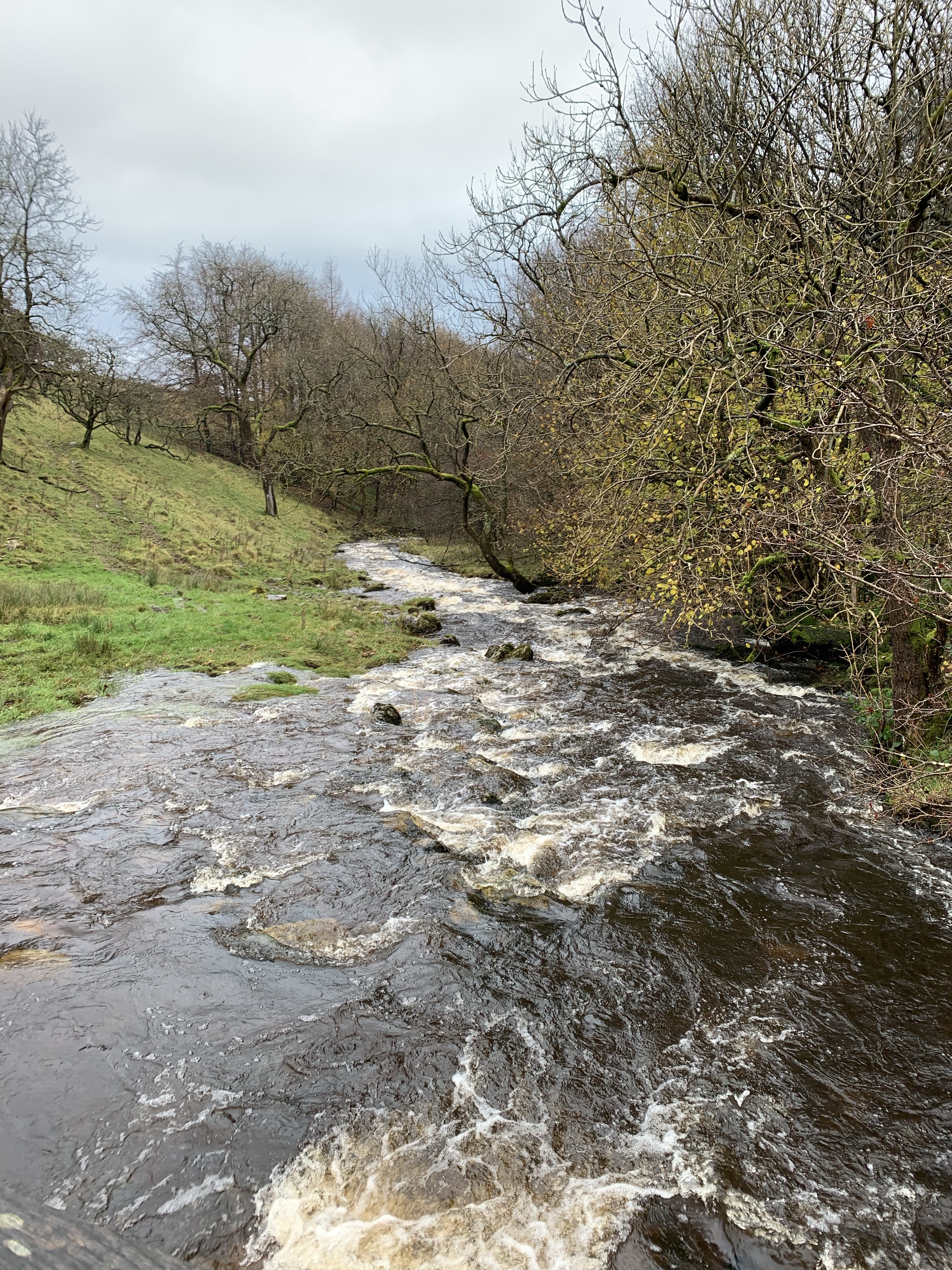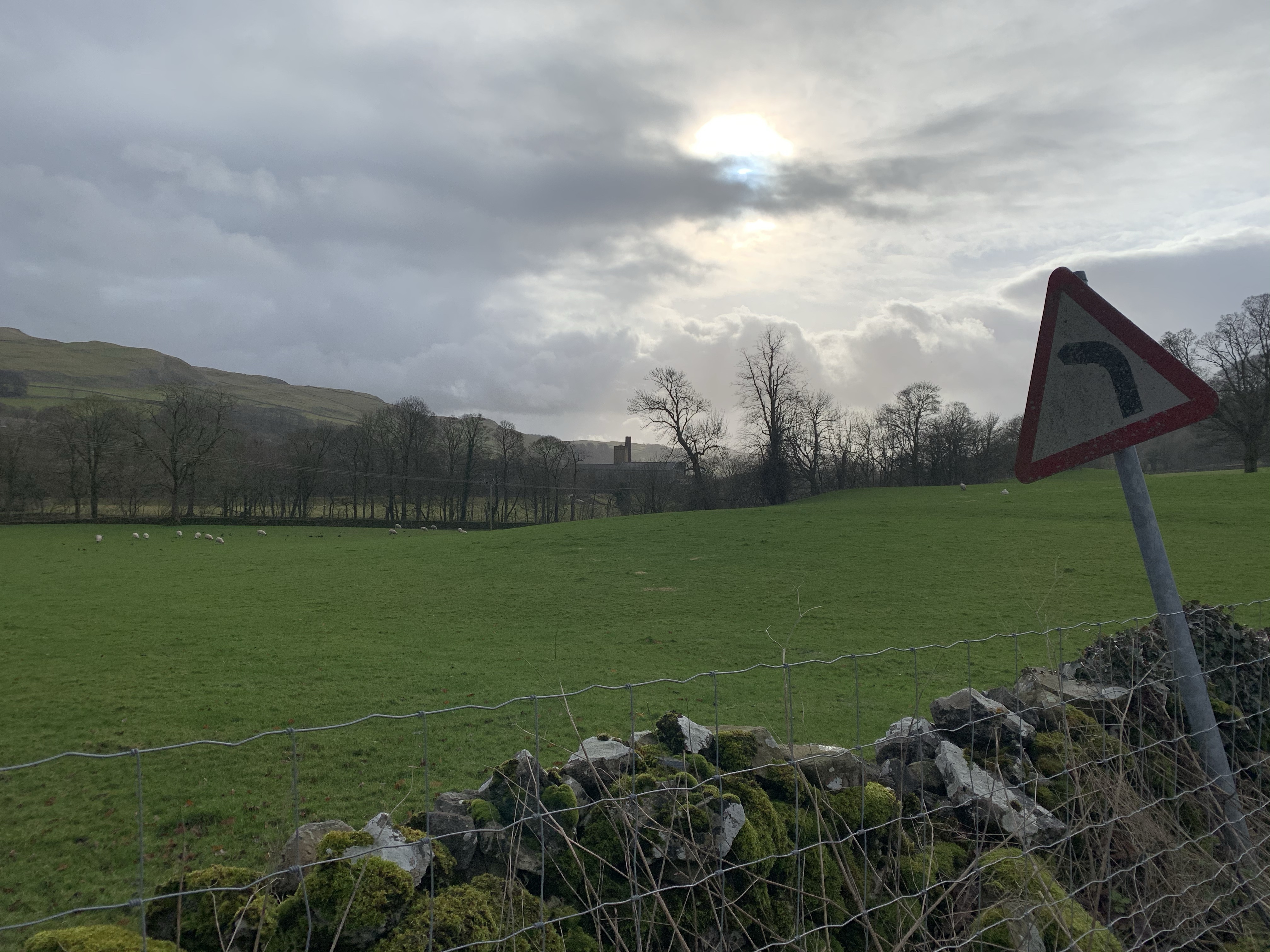 We dropped down the steady incline, to a huddle of cottages and a weir. The River Ribble was high, full of energy. It tumbled down the man made weir with its little runways for the salmon to leap up when spawning. We paused to admire the river, the fields full of ewes ready to lamb and a better view of the fells all around.
