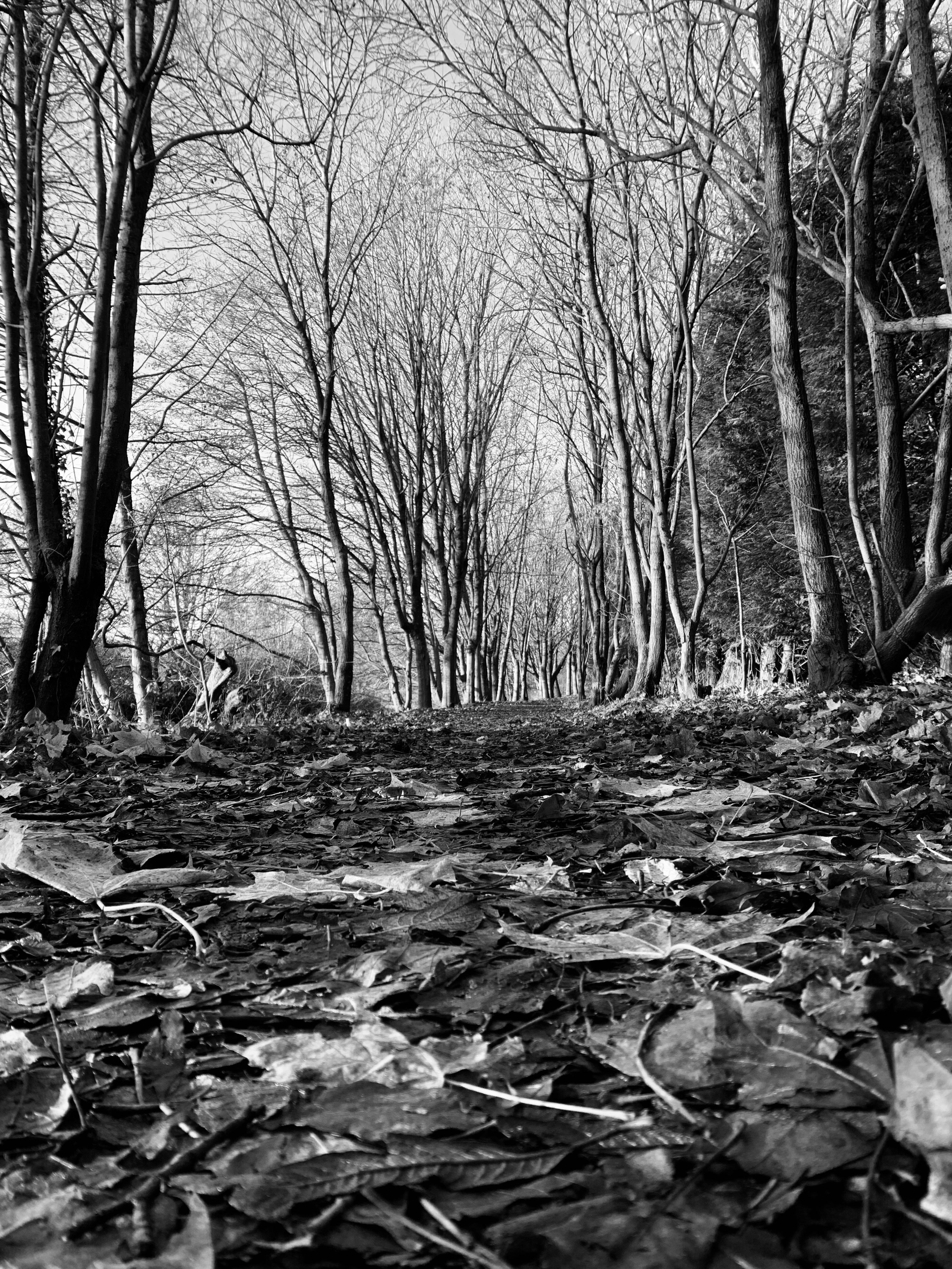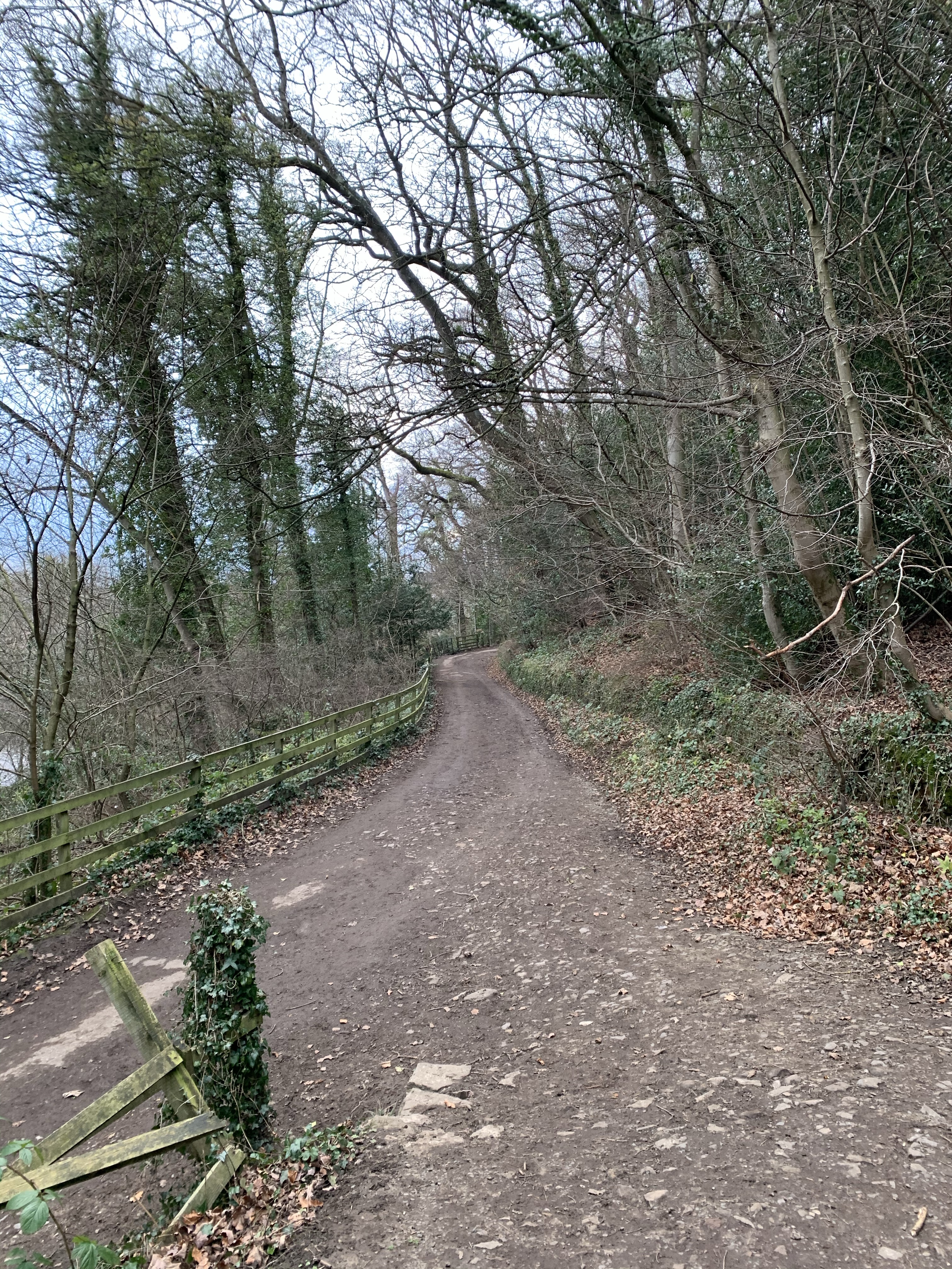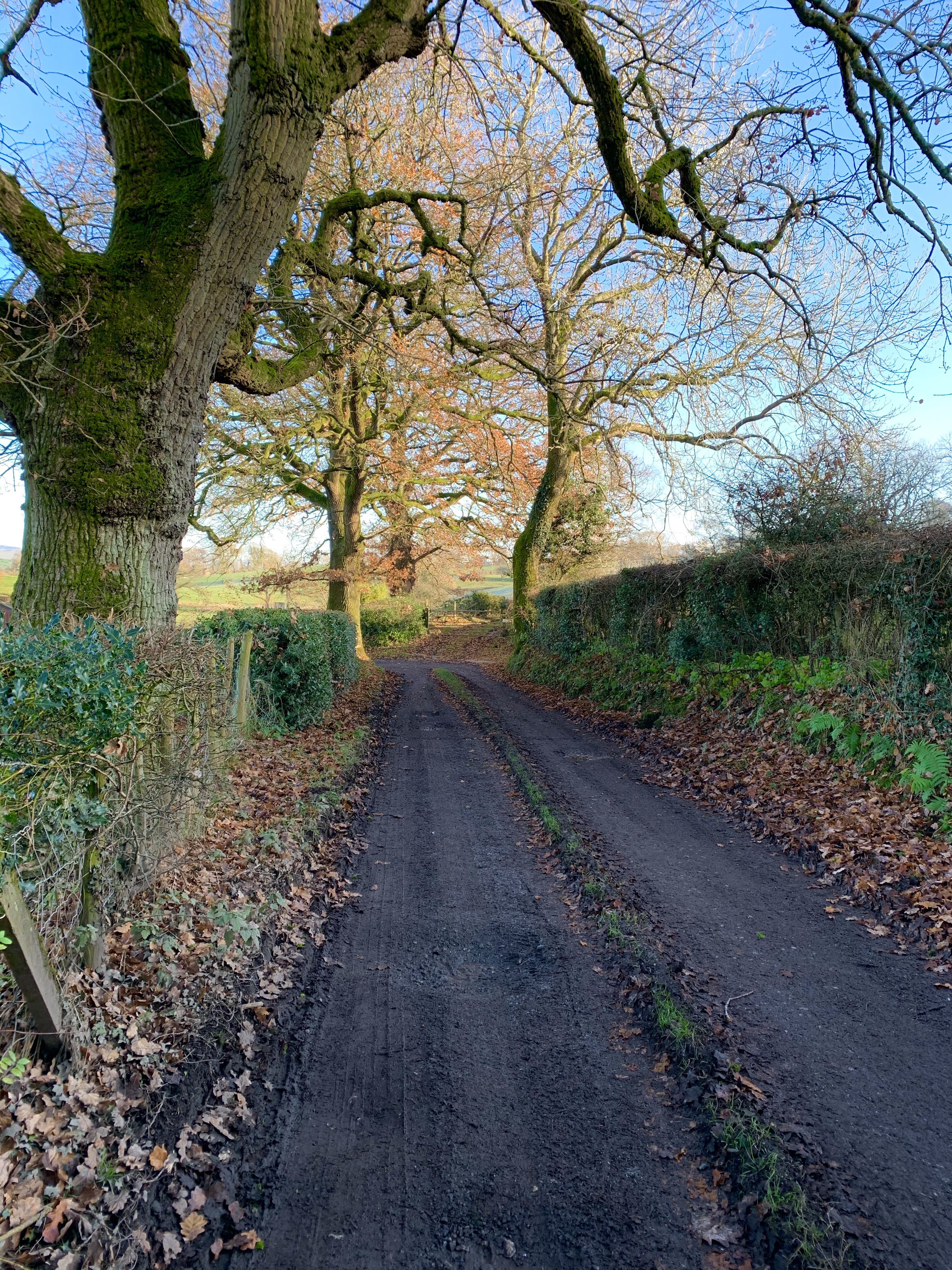 We followed the lane up. The cloud was low and there was no real views. We went past fields and a pretty wood, it’s floor covered with brown beech leaves. It just looked very inviting, but a stern notice informed us it was private and to keep out. We were overtaken by a farmer on a quad bike, his collie dog balancing on the back. Then the lane forked – the left hand side to a gate with private on it and the right, our path, now stony and gravelly. The Dog went back on the lead and we went through the gate.