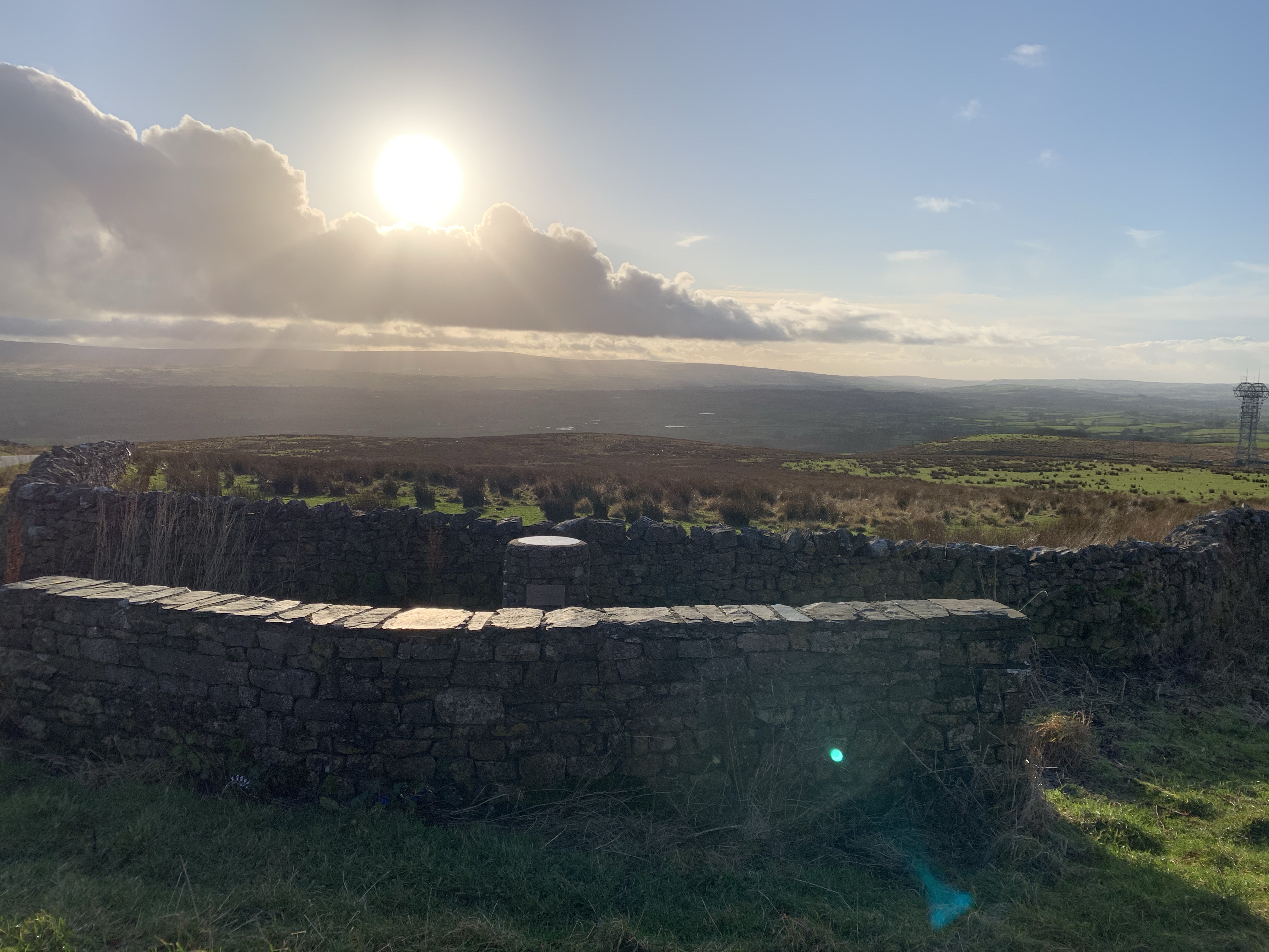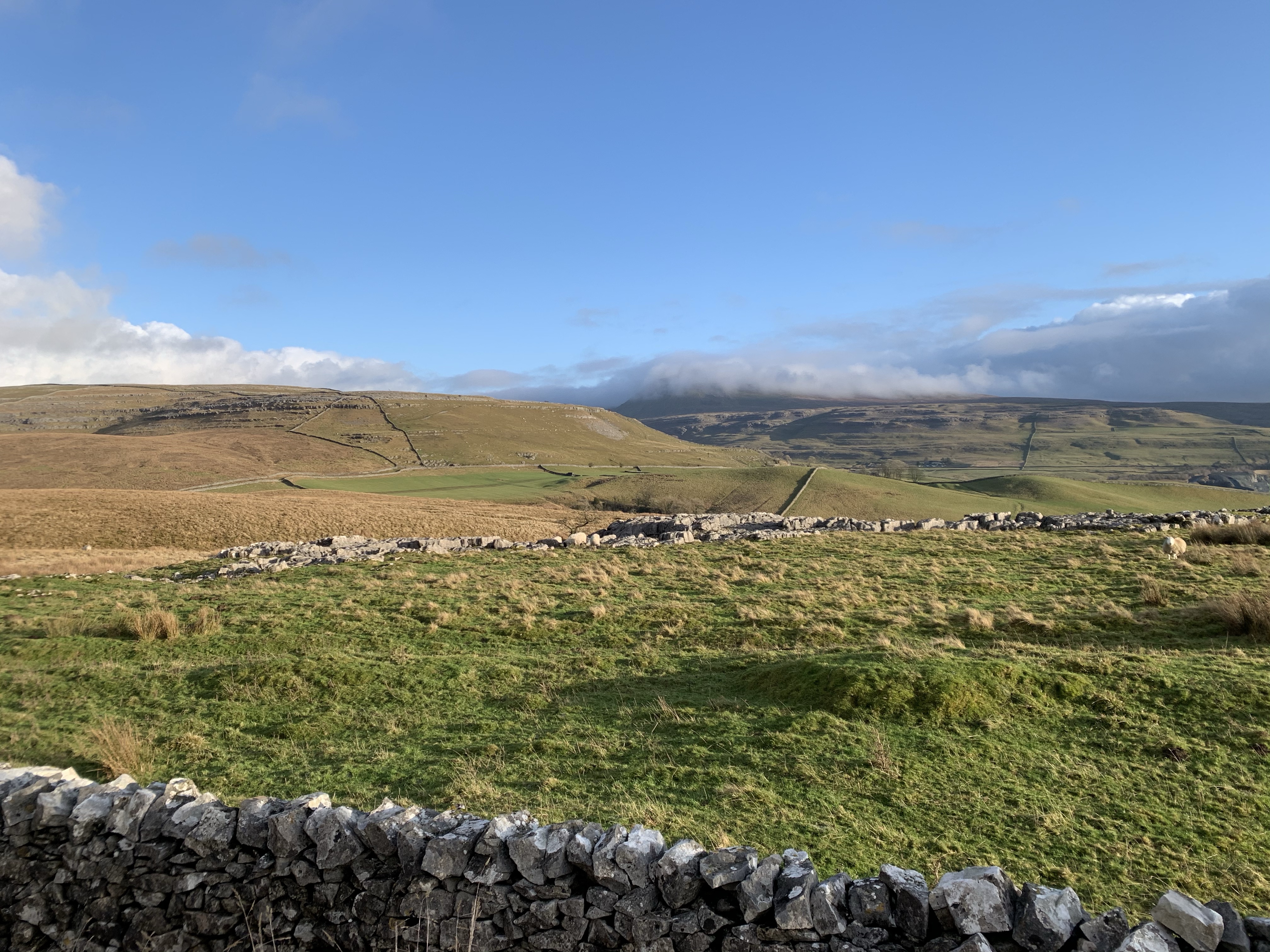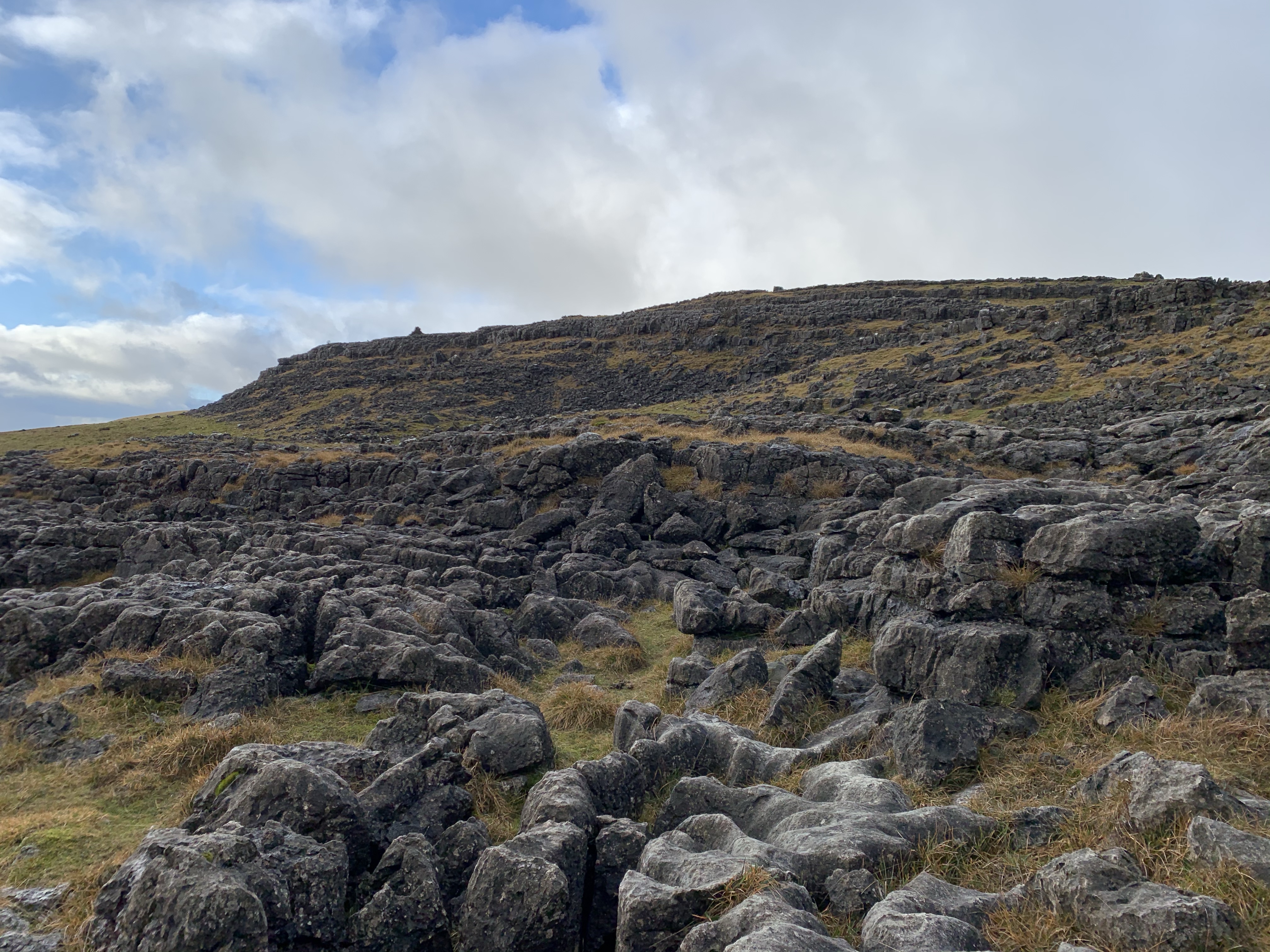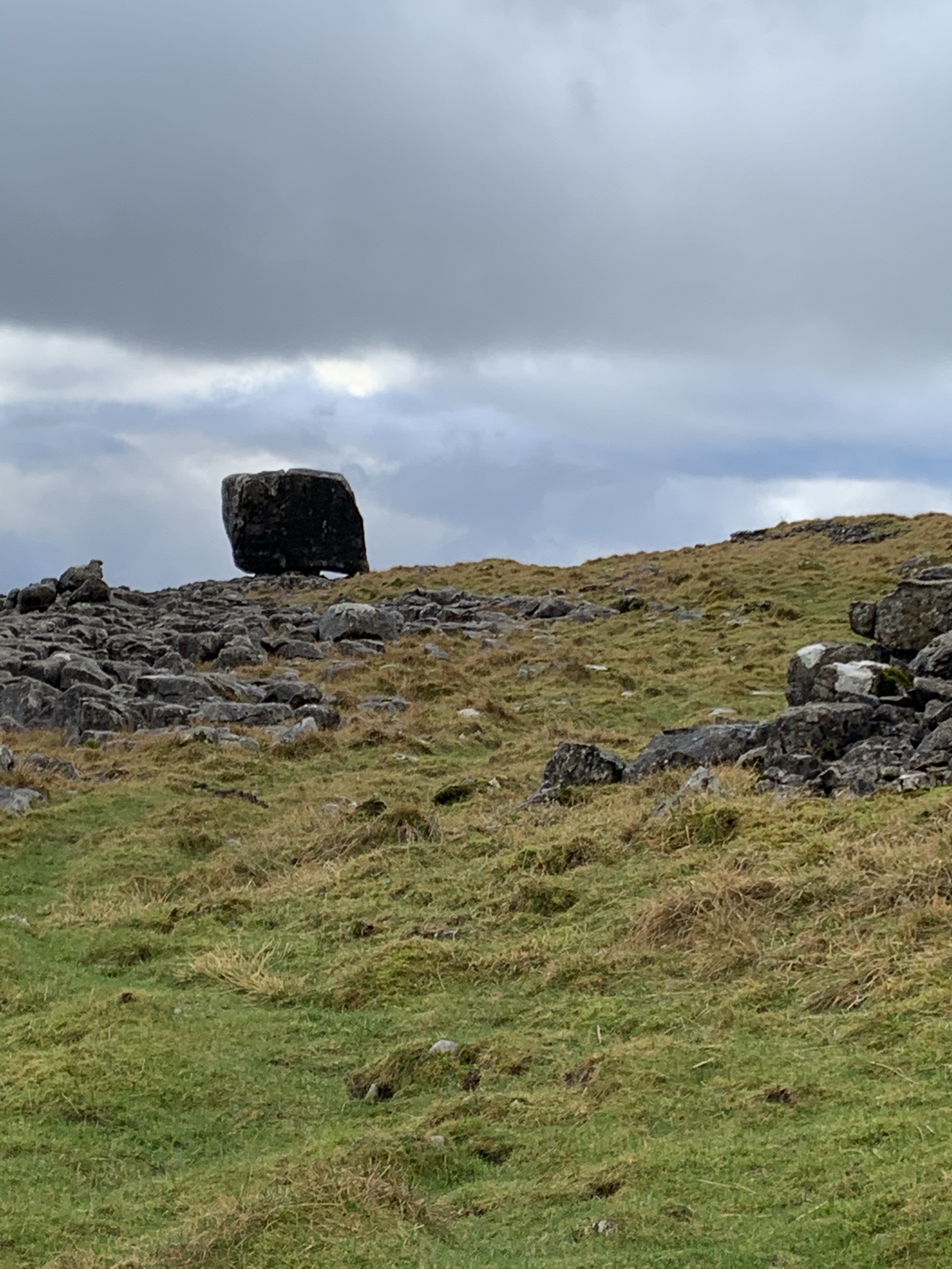 Once over, we continued to pick our way through the remnants of a limestone pavement. You had to watch where you put your feet and look out for wobbly stones. It was a good pull up. Finally the limestone petered out and we were able to stop and take stock. There were fantastic views across the valley. It was a broody day and a haze hung low. We followed a wall across the field until we joined a broad track and turned left.