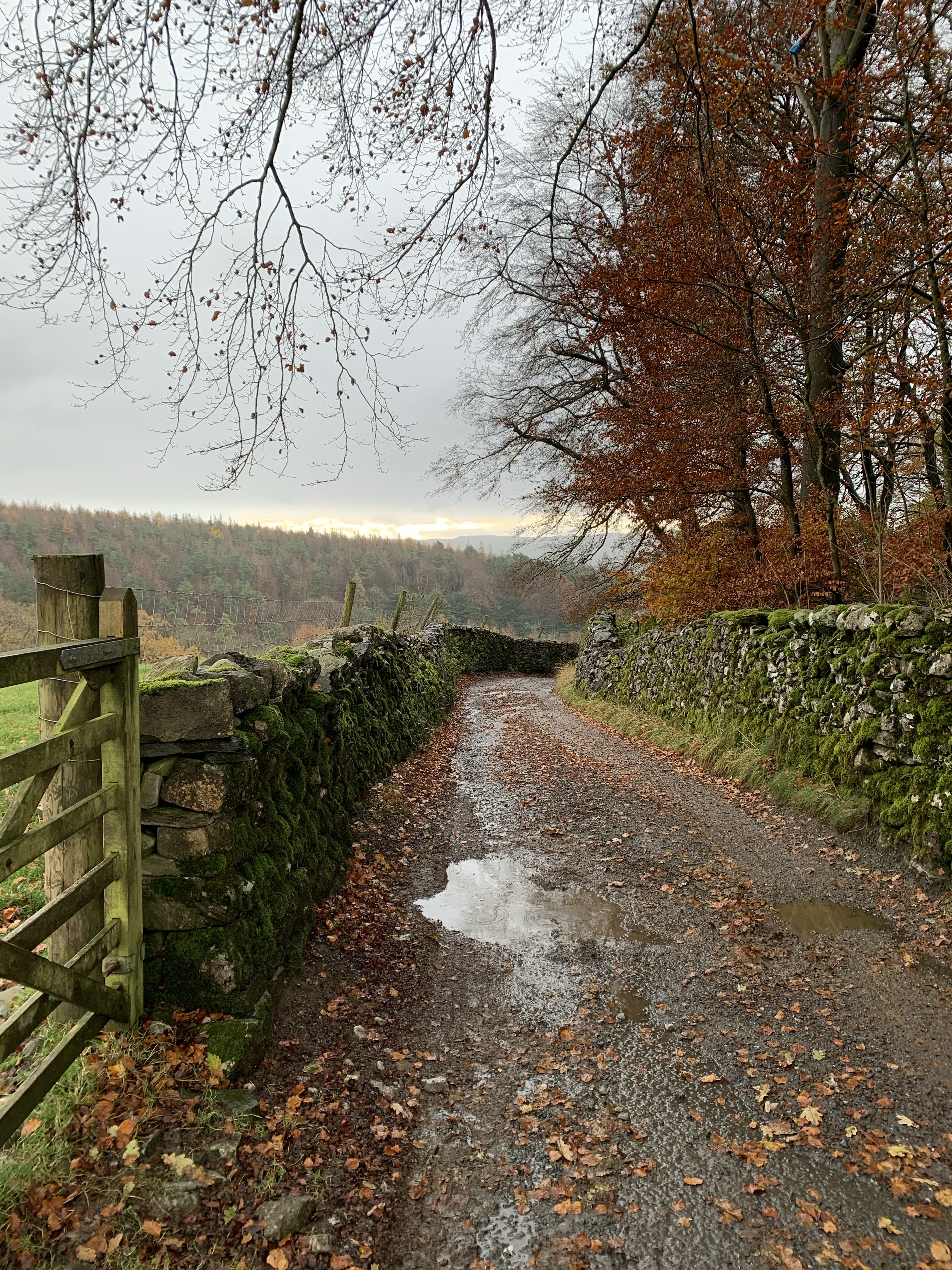 We followed the lane up. The cloud was low and there was no real views. We went past fields and a pretty wood, it’s floor covered with brown beech leaves. It just looked very inviting, but a stern notice informed us it was private and to keep out. We were overtaken by a farmer on a quad bike, his collie dog balancing on the back. Then the lane forked – the left hand side to a gate with private on it and the right, our path, now stony and gravelly. The Dog went back on the lead and we went through the gate.