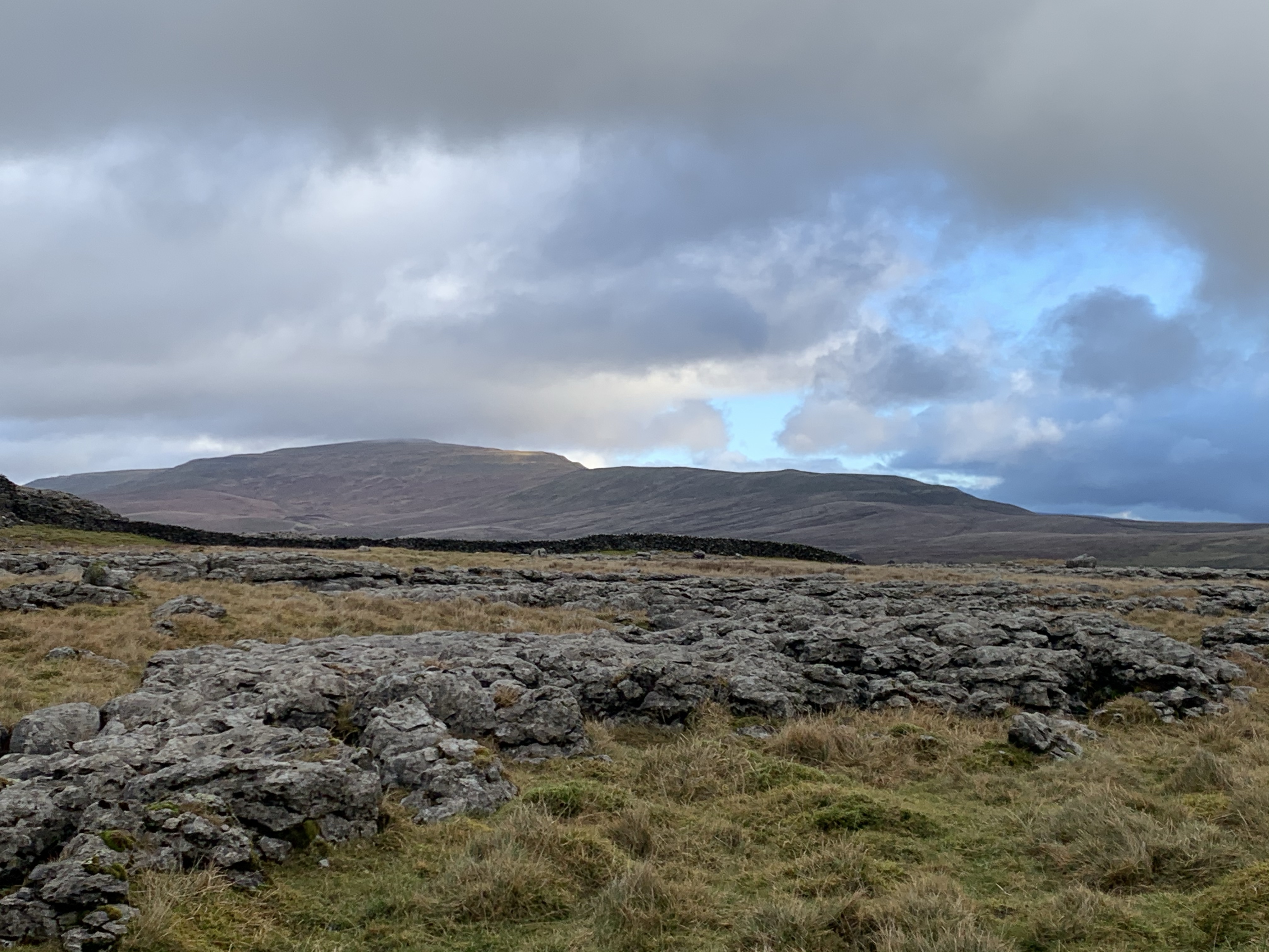 Once over, we continued to pick our way through the remnants of a limestone pavement. You had to watch where you put your feet and look out for wobbly stones. It was a good pull up. Finally the limestone petered out and we were able to stop and take stock. There were fantastic views across the valley. It was a broody day and a haze hung low. We followed a wall across the field until we joined a broad track and turned left.