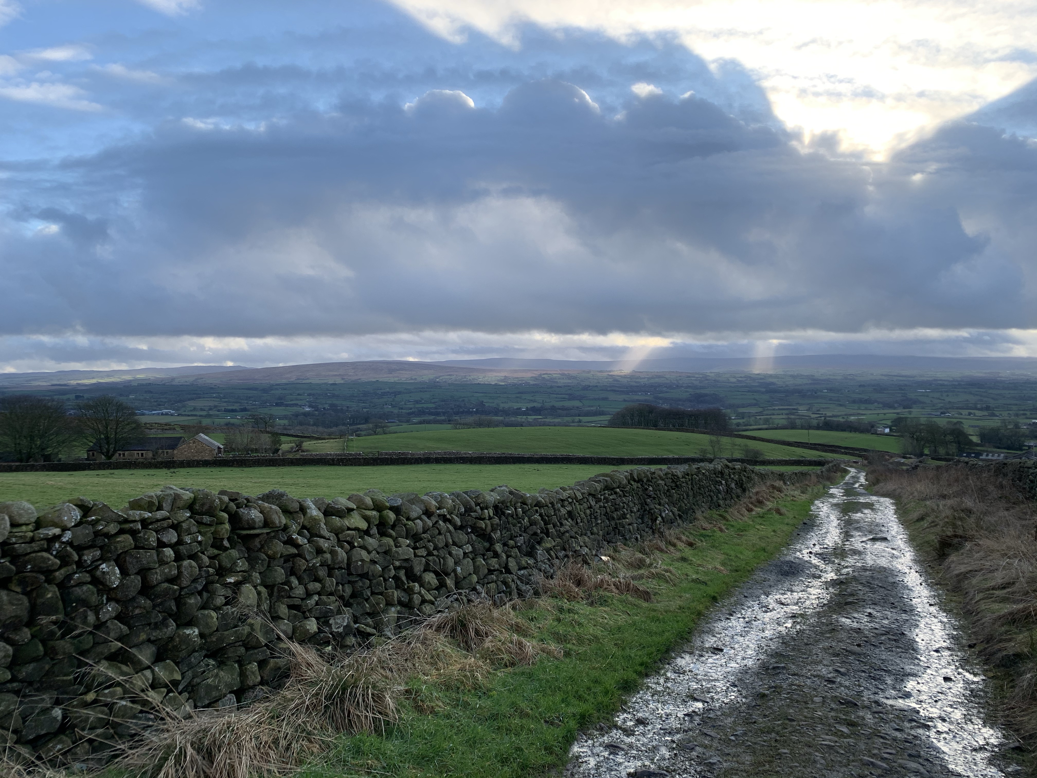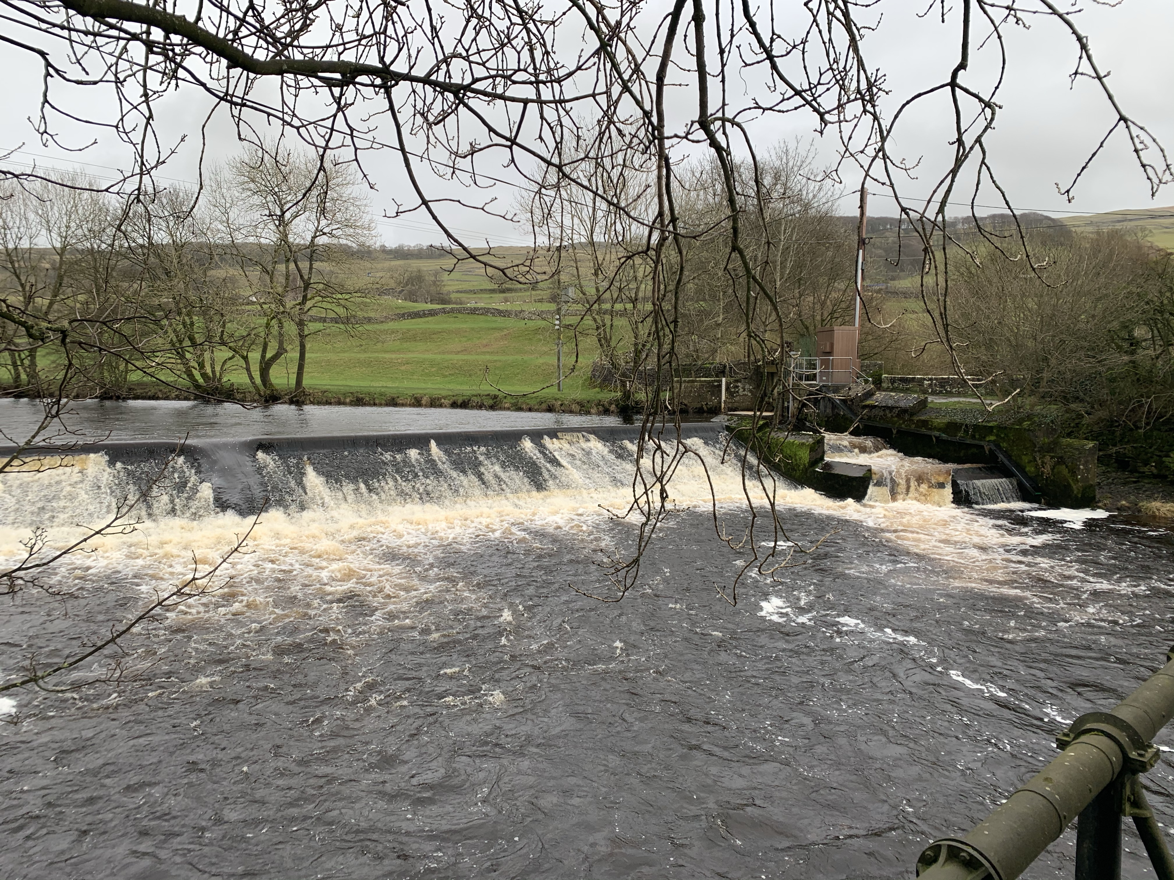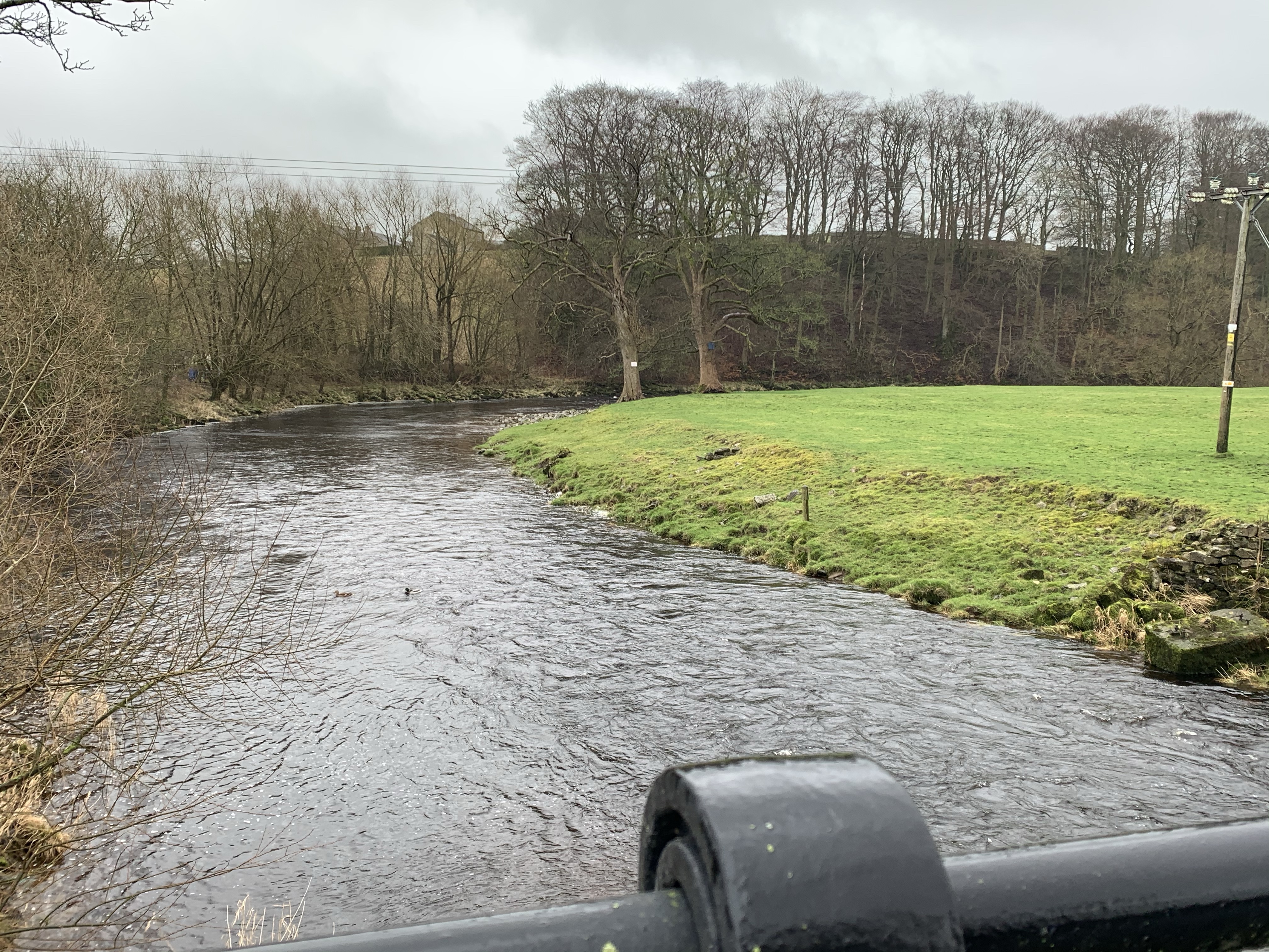 We dropped down the steady incline, to a huddle of cottages and a weir. The River Ribble was high, full of energy. It tumbled down the man made weir with its little runways for the salmon to leap up when spawning. We paused to admire the river, the fields full of ewes ready to lamb and a better view of the fells all around.