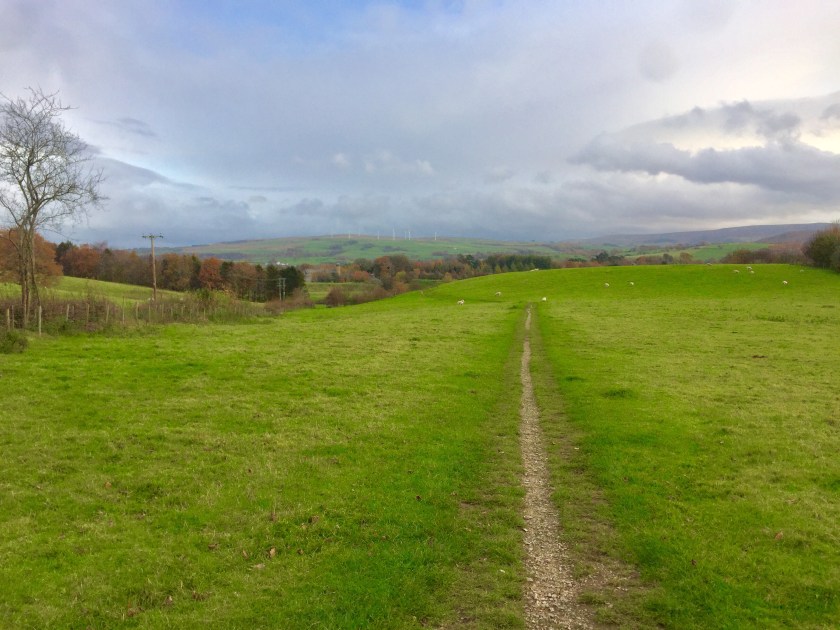 We finally dropped onto a road, crossed it and continued down a wide driveway opposite, past a large group of buildings. I let The Dog off lead with the path enclosed which she was grateful for. We contoured along the ridge, then the path dropped down towards a scruffy farmyard, full of old rusting cars, farm machinery and other abandoned implements. God bless farmers and all the hard work and hours they put in, but why are their farmyards more akin to scrap metal yards? Farmers seem to have this obsession to hoard almost anything in the belief that one day, it will come in handy. I think it could be a man thing. Hubby can be a bit like that – there’s bits that I would happily chuck, but he prevents me with “one day, that might come in useful” and on occasion, it does (much to my despair) and I get a smug and timely reminder from a very happy hubby. But I have to scratch my head sometimes to when a dilapidated old tractor with its wheels missing and taken over by weeds will ever become useful again………..