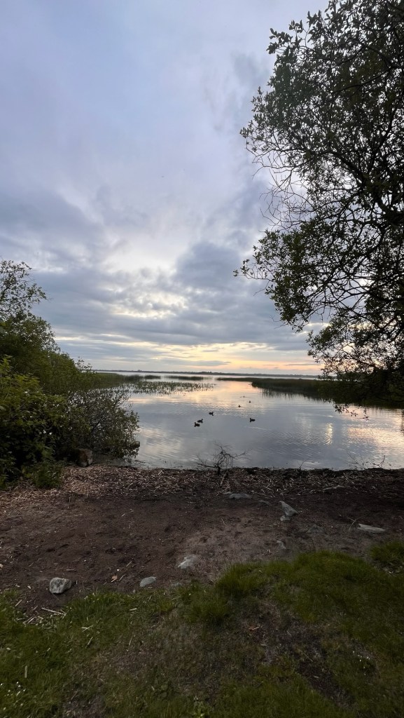 We went onto smaller country roads, through rolling countryside and broken sunshine. Finally, Mullingar appeared and we drove through its long and interesting High Street – well no, we crawled. There was so much traffic that it was almost at a standstill. We needed a campsite, so on spotting the local Tourist Information office, I hopped out and scuttled back to sort something out while hubby went to park the Van. The young lady was pleasant and helpful, and between us we contacted the Lough Ennell Caravan Park, some 7km down the road and ascertained we could stay the night. A brief visit to the local Aldi for more provisions and some teatowels (I had failed to put the original towels back after washing them -duh) we headed for the site. On the shore of Lough Ennell we were greeted by Eamon and after signing in, we were shown our spot in a little area with four other campers. Perfect.