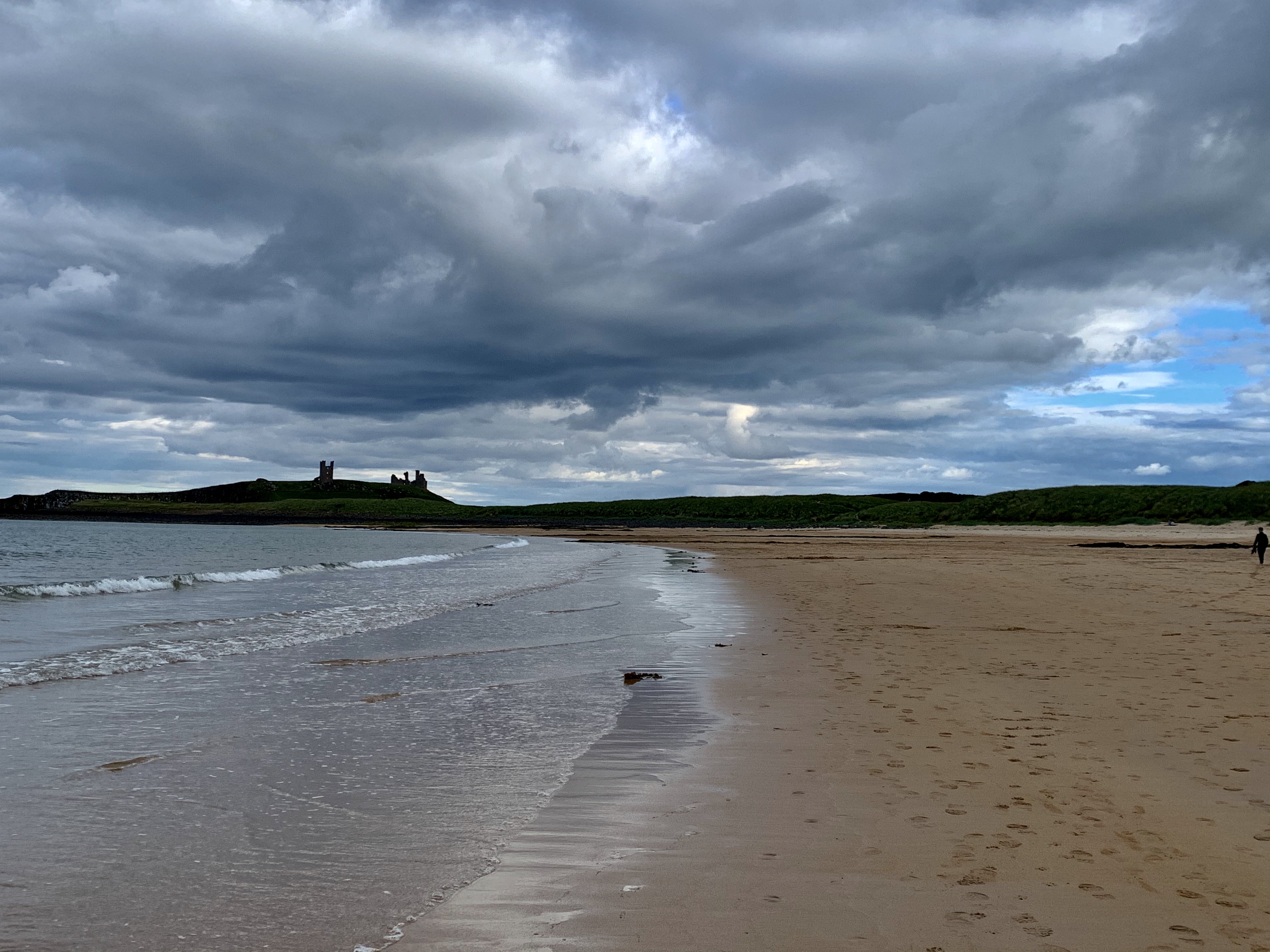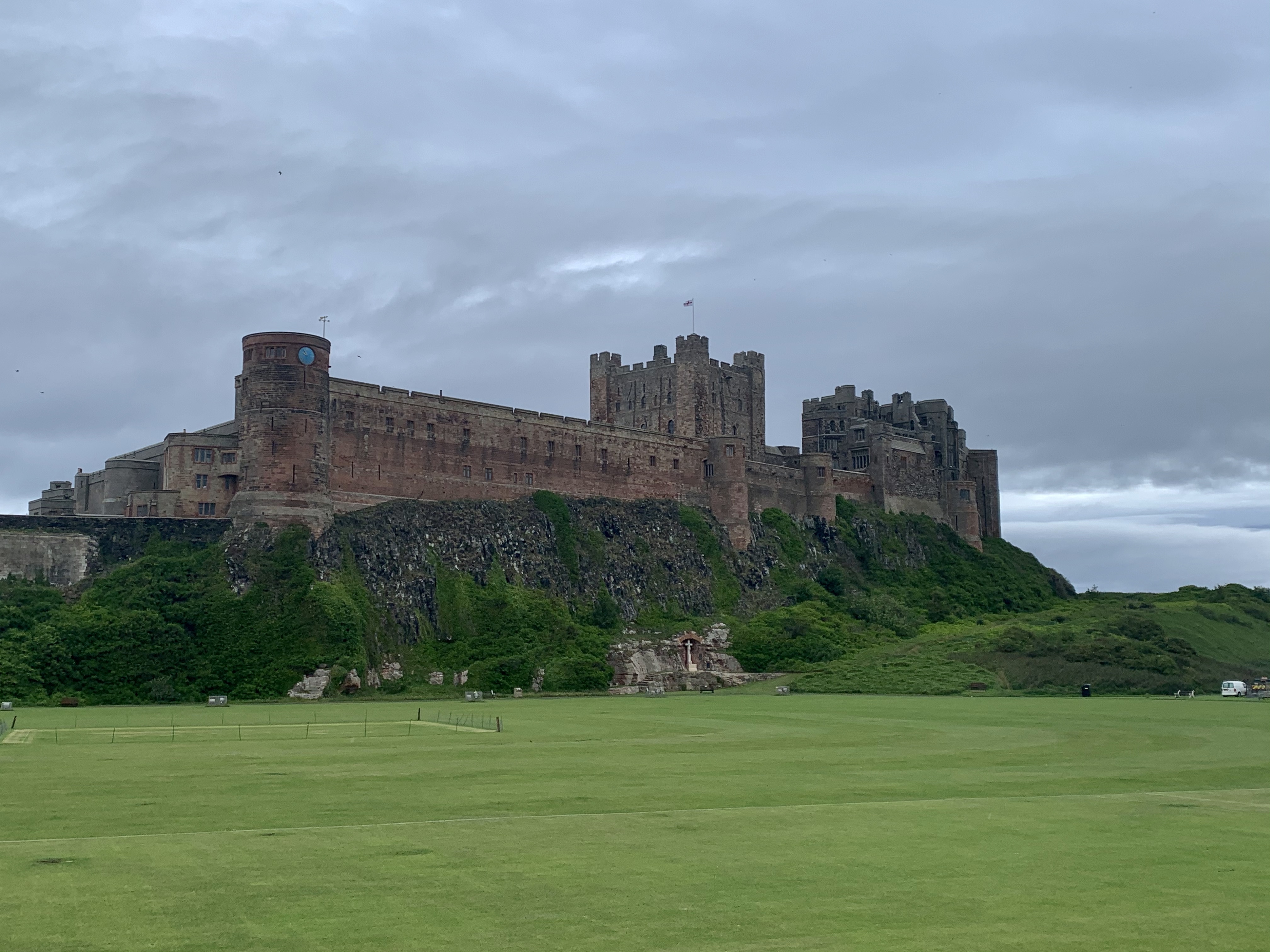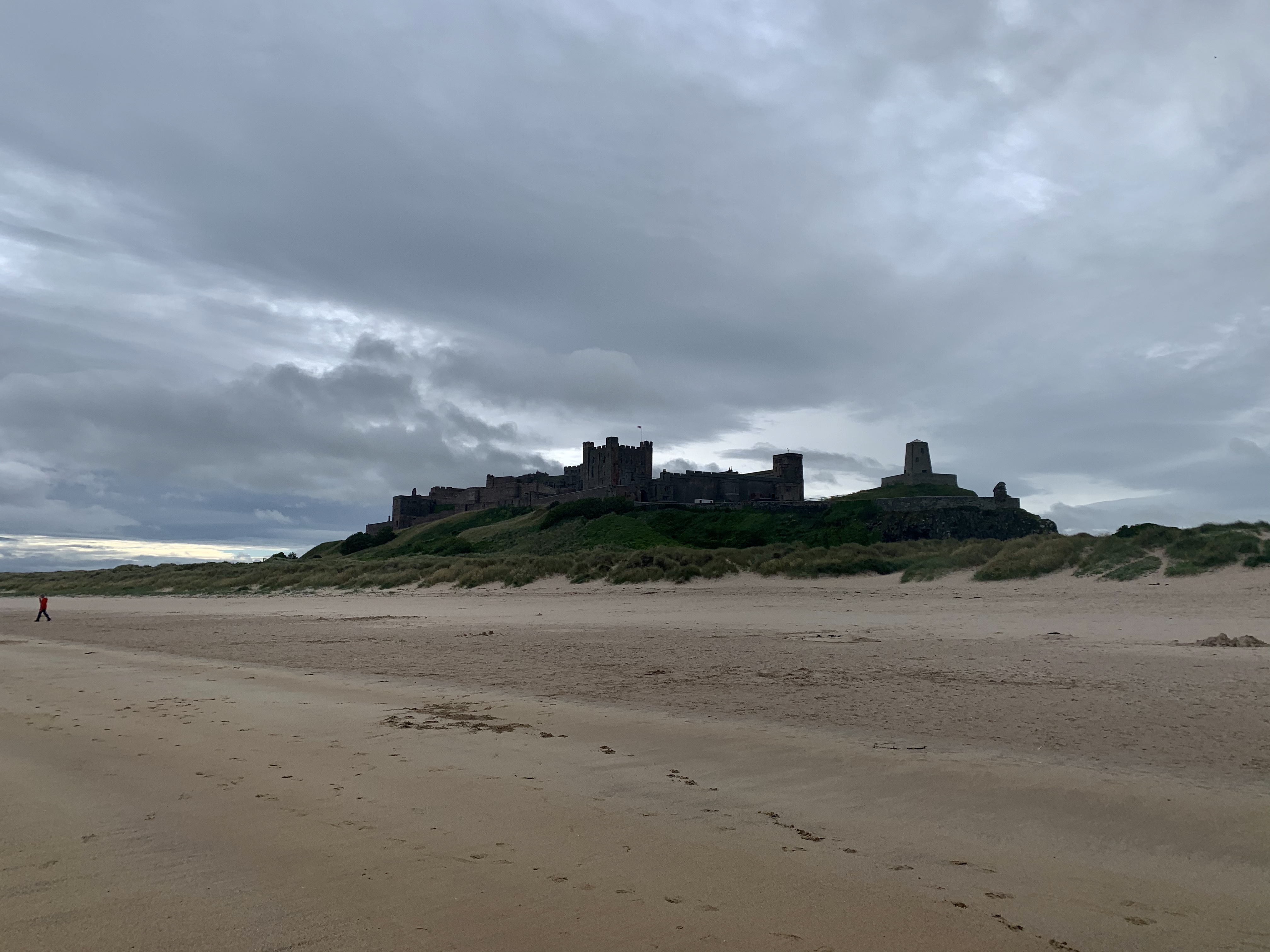 We head north towards Beadnell, and keep on the smaller coastal roads, hugging the coast until we reach Bamburgh and its magnificent castle dominating the village. We find a car park that accommodates motorhomes (so many car parks have either height barriers or just no parking spaces for anything larger than a car). We feed the parking meter lots of money (the prices start at 3 hours and £3.50) and wander through a park alongside the castle, through sand dunes and onto one of the most beautiful, stunning beaches of Northumbria. Immensely wide and flat with golden, soft sand, it is wonderful scene with the Bamburgh Castle as the backdrop. The Dog has somehow found more energy and is excited for some ball throwing and chasing. We saunter up the beach, the wind brisk and the clouds low and threatening. It keeps spitting rain. We’re dressed in shorts and several layers of warm jumpers and raincoats. Don’t you just love the British weather?