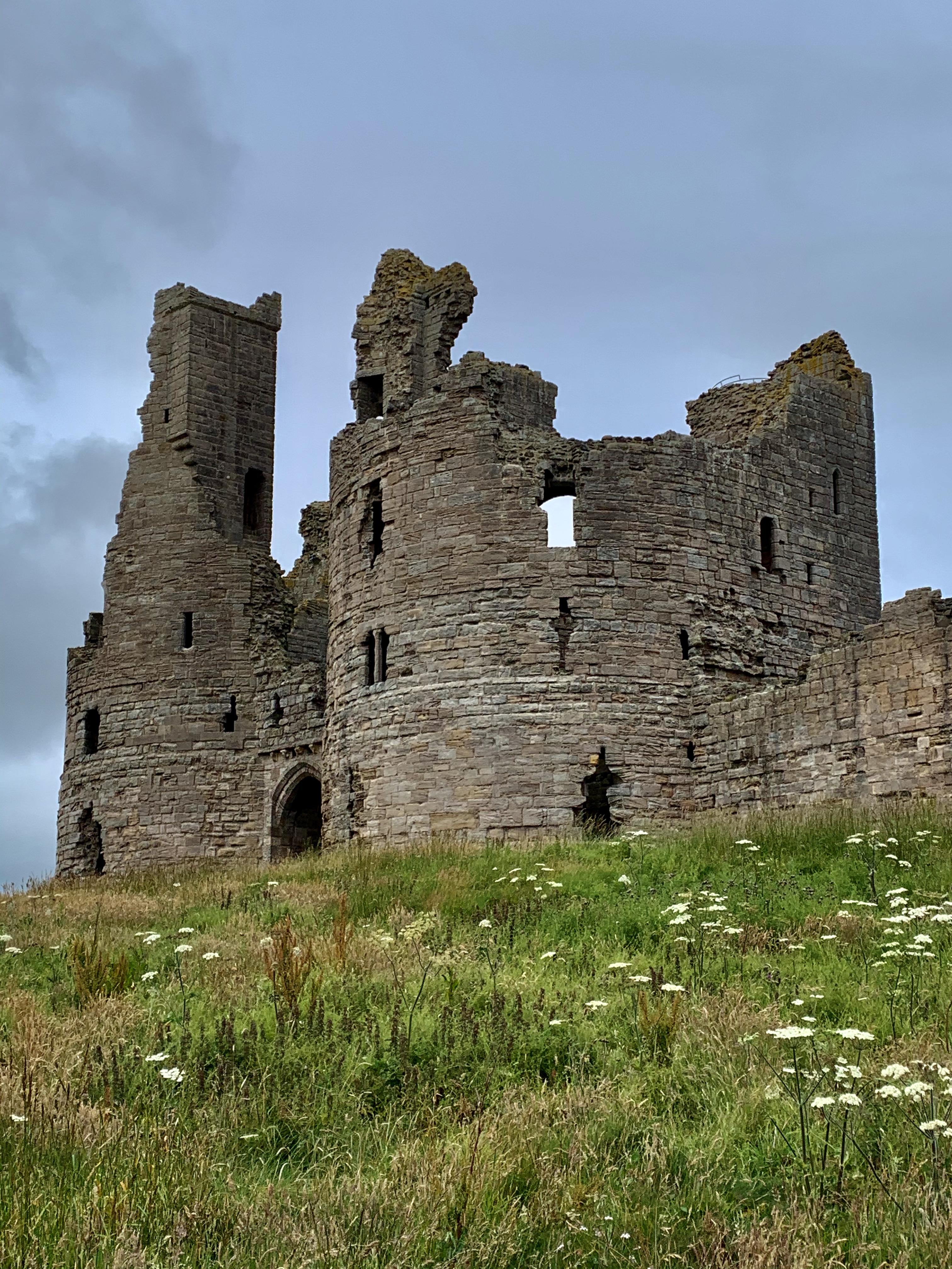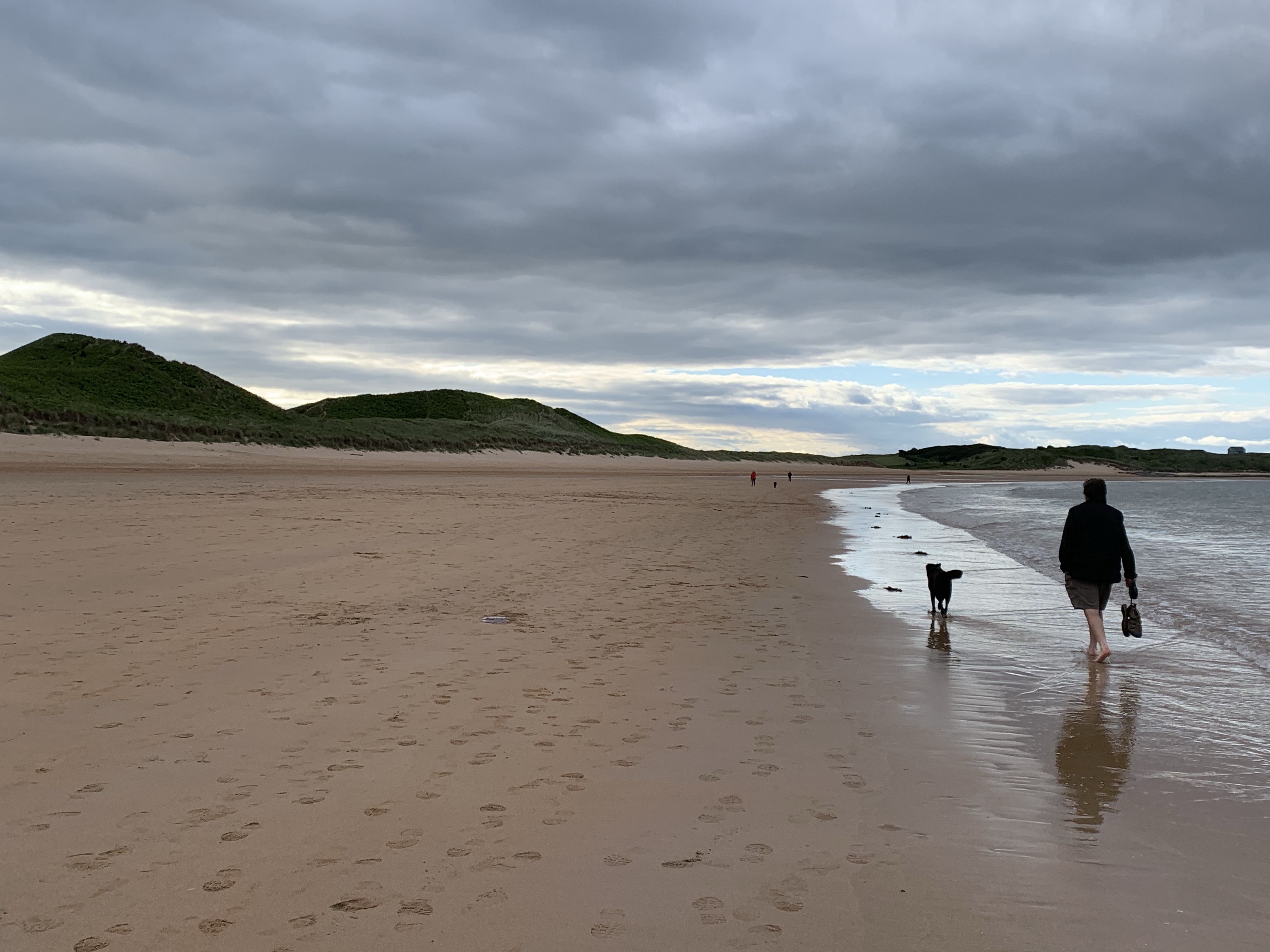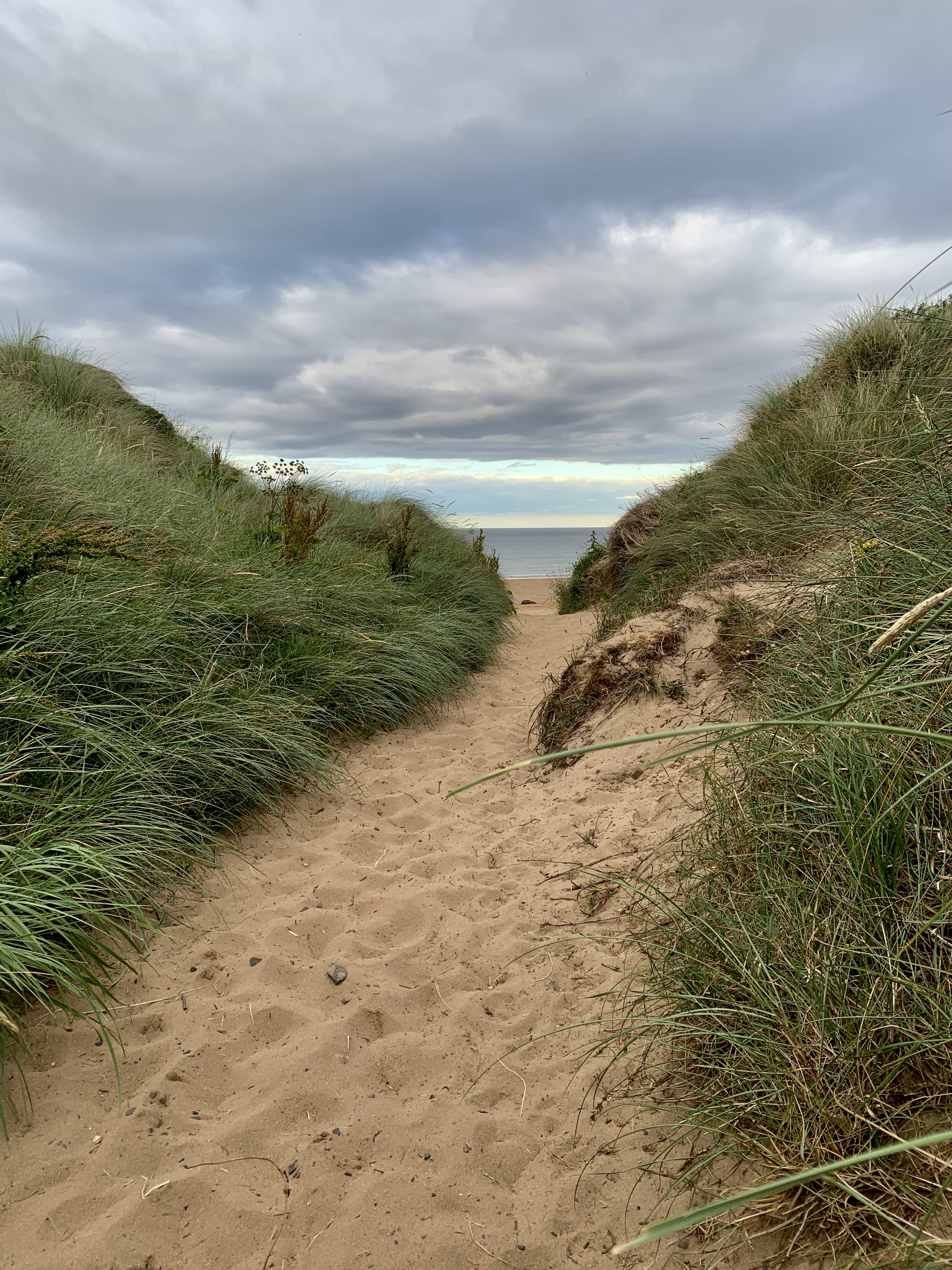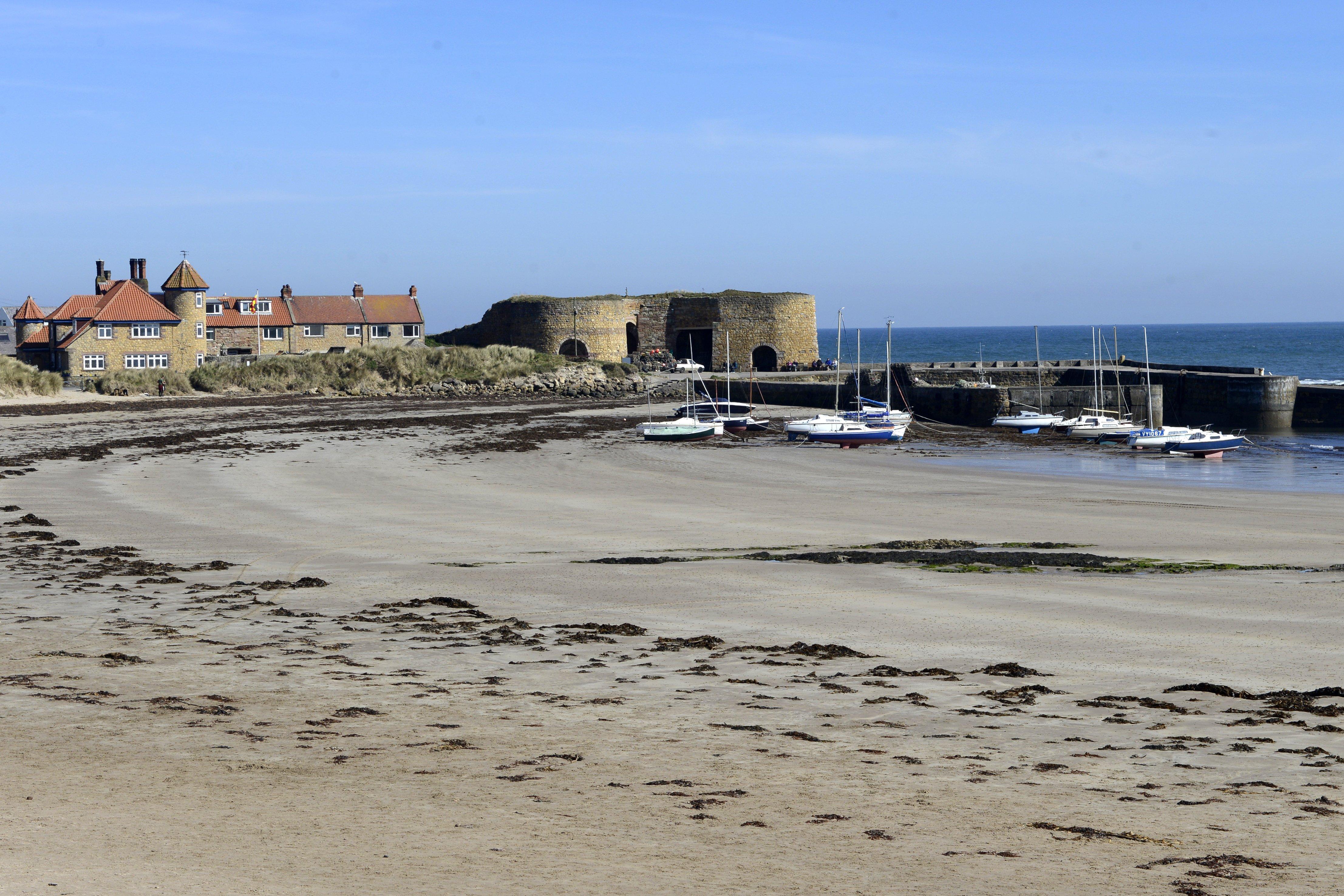 We head north towards Beadnell, and keep on the smaller coastal roads, hugging the coast until we reach Bamburgh and its magnificent castle dominating the village. We find a car park that accommodates motorhomes (so many car parks have either height barriers or just no parking spaces for anything larger than a car). We feed the parking meter lots of money (the prices start at 3 hours and £3.50) and wander through a park alongside the castle, through sand dunes and onto one of the most beautiful, stunning beaches of Northumbria. Immensely wide and flat with golden, soft sand, it is wonderful scene with the Bamburgh Castle as the backdrop. The Dog has somehow found more energy and is excited for some ball throwing and chasing. We saunter up the beach, the wind brisk and the clouds low and threatening. It keeps spitting rain. We’re dressed in shorts and several layers of warm jumpers and raincoats. Don’t you just love the British weather?