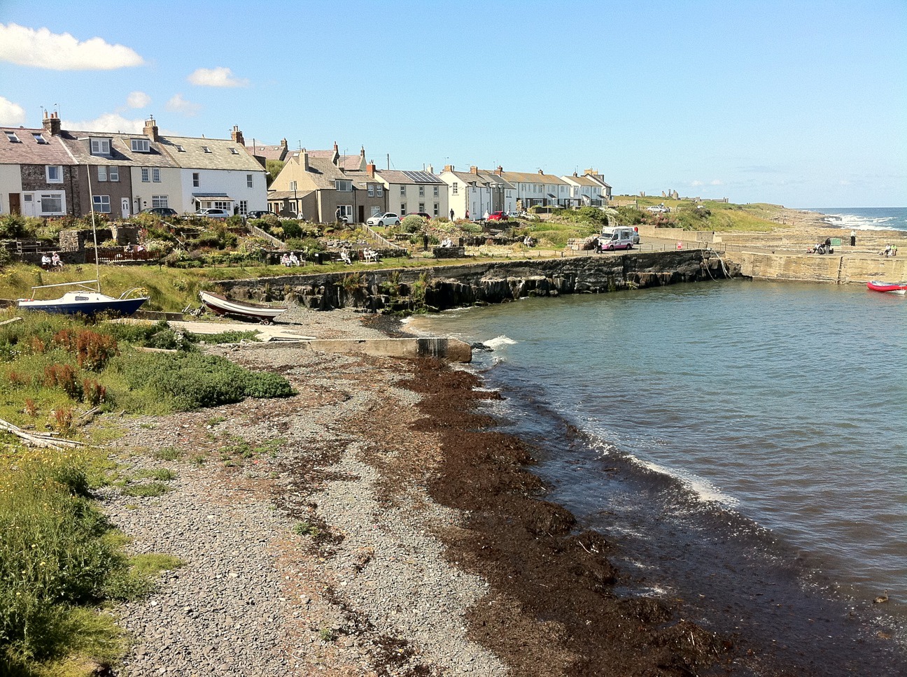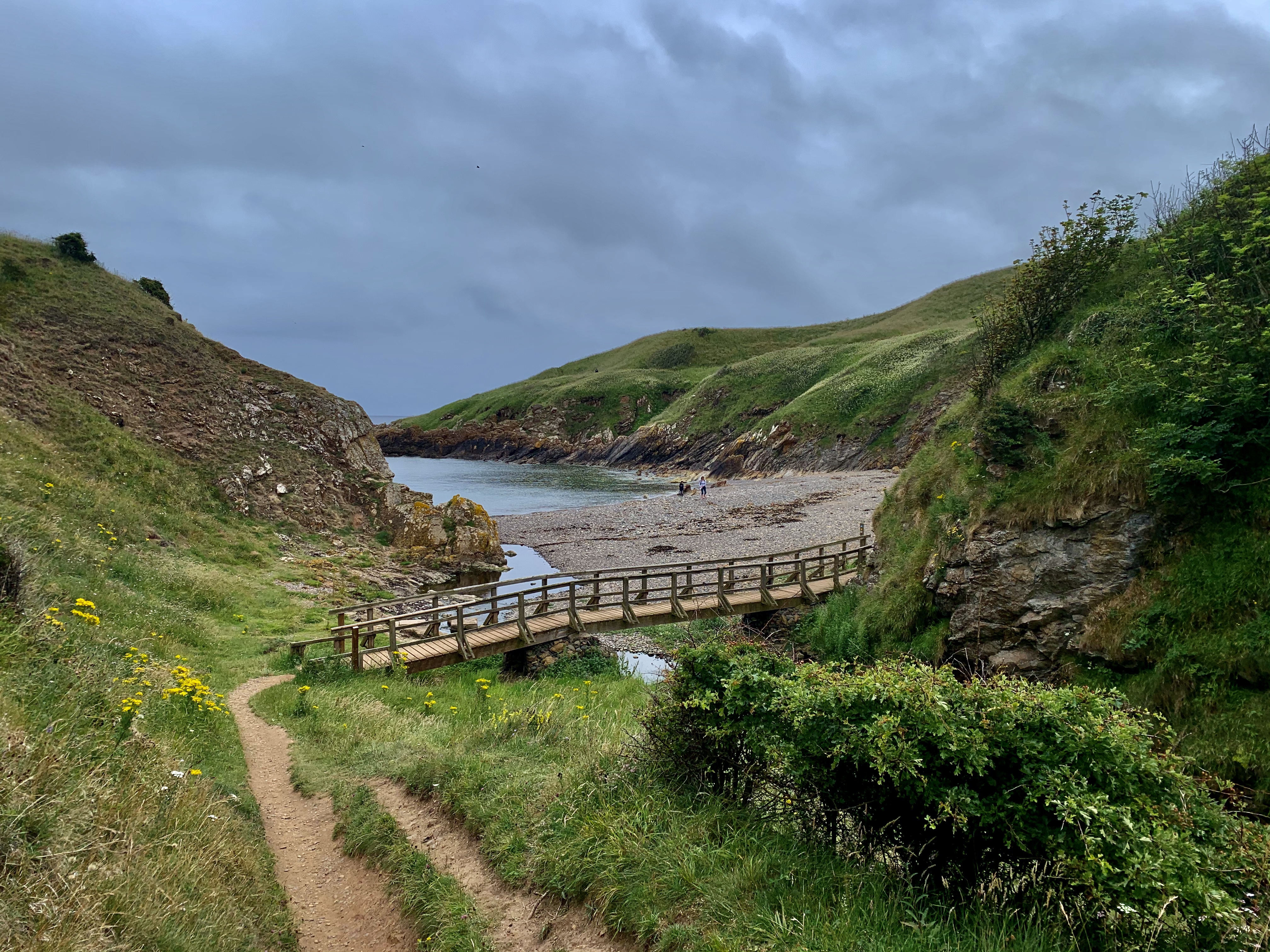 So we waved at Haggerston as we shot past, and carried on to Berwick Upon Tweed, a pleasant little town on the coast. We weren’t in the mood for wandering around a town and so continued on the A1, and crossed into Scotland a few miles from Berwick. We dropped into the little town of Eyemouth and gave it a quick tour – it looked quite nice, but the parking of our vehicle sort of put us off. (There’s pros and cons to this motorhoming lark). We followed the road out again and decided to check out St.Abbs, a bit further north for some reason. We actually ended up at The Mount and the cutest little bay. We managed to wedge the Van into a car parking spot, and walked down the short hill, to find a little cafe, toilets and a little bay of sand with several delightfully painted beach huts set back, all surrounded by rock. It was lovely and several other people thought so too, as it was quite busy with families playing on the sand. We picked our way through and headed to a grassy headland and climbed up. Here there was a bench overlooking the bay and so we sat down to admire the view. What a lovely little place. We then carried on walking, clambering up to the summit of the headland, before following the path to the next cove. This one was a pebbly one, accessed by a wooden bridge. We stayed here quite a while, skimming stones and throwing a stick in the water for The Dog. Apart from a mum and her son, we were the only ones here. We cursed that we had left our crab sandwiches in the Van – we weren’t expecting such a perfect place for lunch.