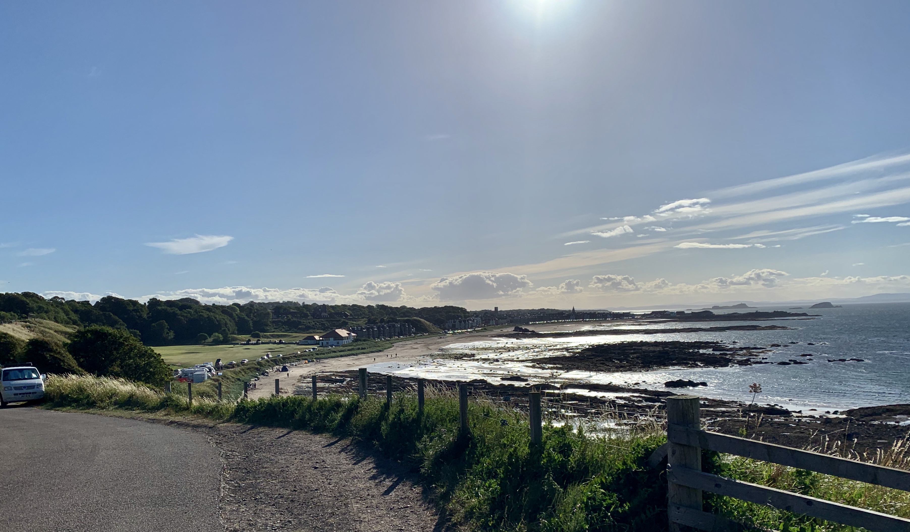 We decide to stretch our legs with a tour (well, more like a nosey) of the campsite and wander to the beach. Yet another golf course to negotiate with busy golfers (the coast here is named the Golf Coast) and we watch out for any badly hit balls flying towards us. We stop at a small car park just outside the golf course, full of motorhomes that are “wild camping” despite notices declaring “No Overnight Parking”. To our right, is another grassy headland heading up and over, to our left, a wide sandy beach leading towards North Berwick itself. This needs checking out, but it will be tomorrow now. We saunter back to the Van.