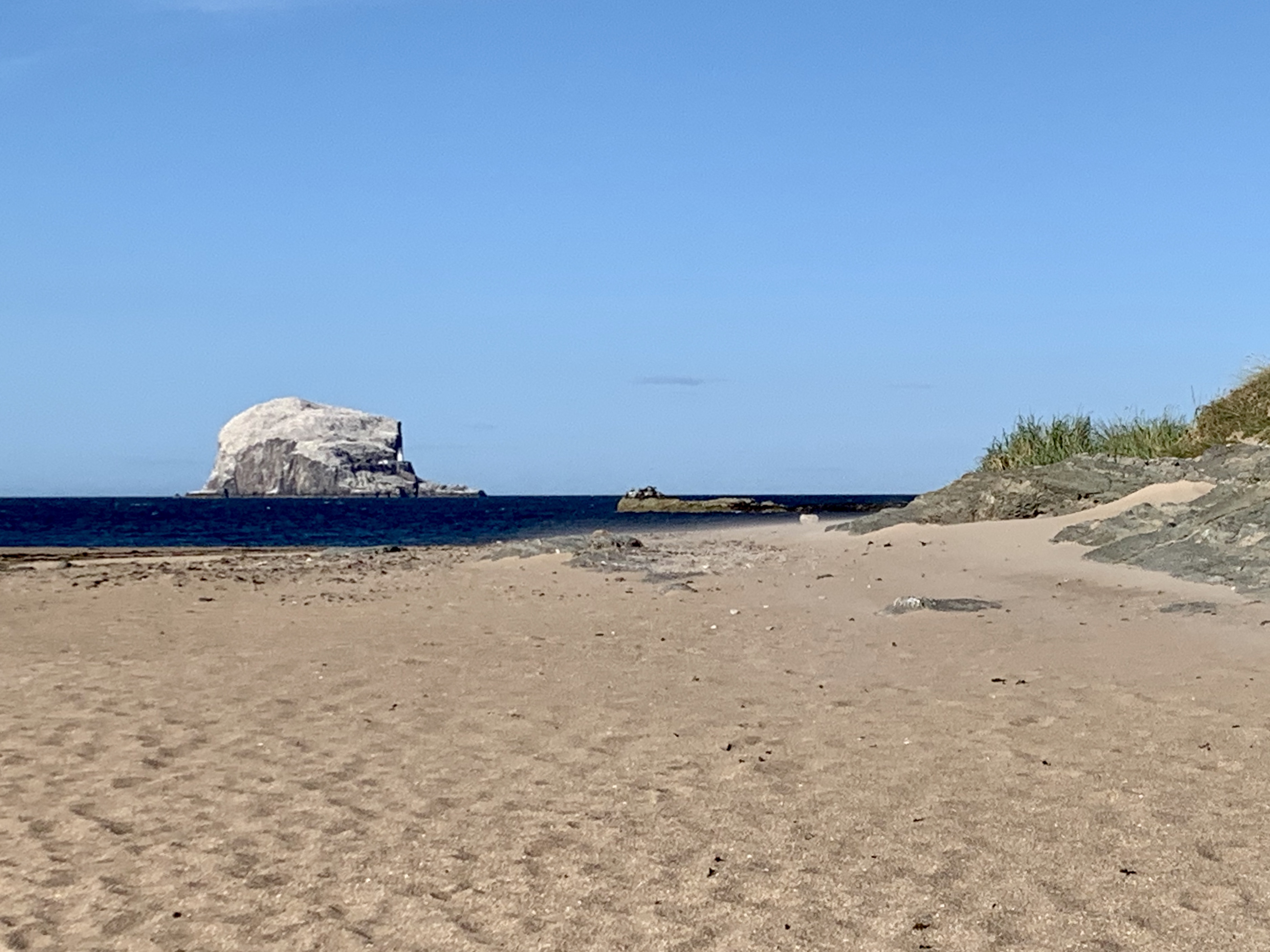 We drove to our next campsite at North Berwick – Tantallon Camping site. Just on the outskirts of town, we find the site rather pleasant. A mixture of static homes, tents, caravans and motorhomes, we are allocated a spot towards the back of the site which is perfect, as it all gently slopes towards the Firth of Forth, giving us a lovely view to the west and north. We overlook the islands of Craigleith and Bass Rock, home to thousands of seabirds and behind us, the The Law, a huge conical towering hill, that looks like it’s been dropped there. It looks so out of place from the rolling countryside around it. This area was very volcanic and there’s plenty of clues here, hence The Law.